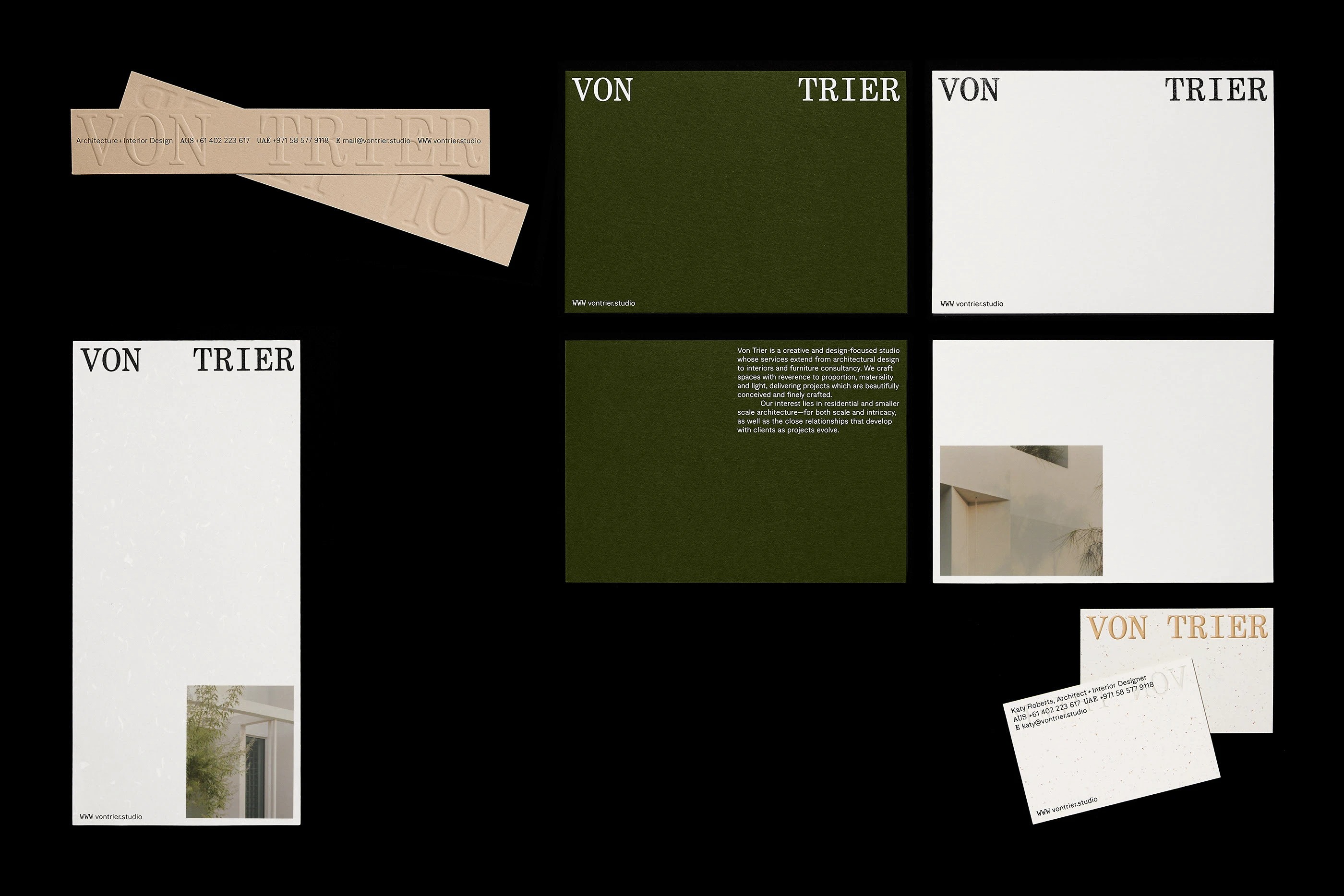 Von Trier is an architecture and interior design practice based in Dubai, working across borders with a sensibility shaped by movement, observation, and restraint. When it came to defining their visual identity, the task was not to compete with the architecture—but to quietly echo its values.