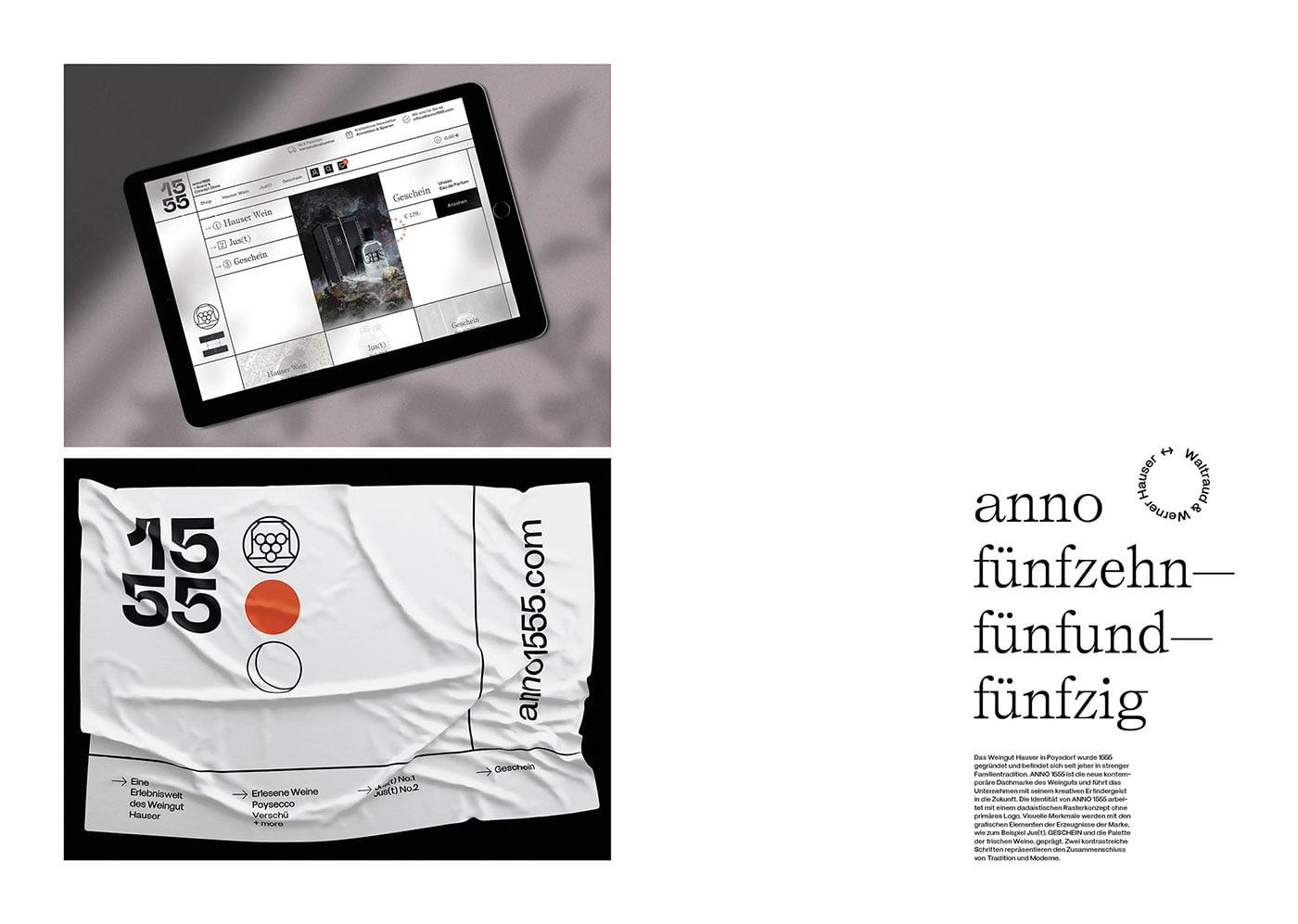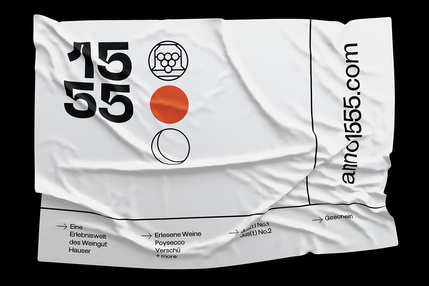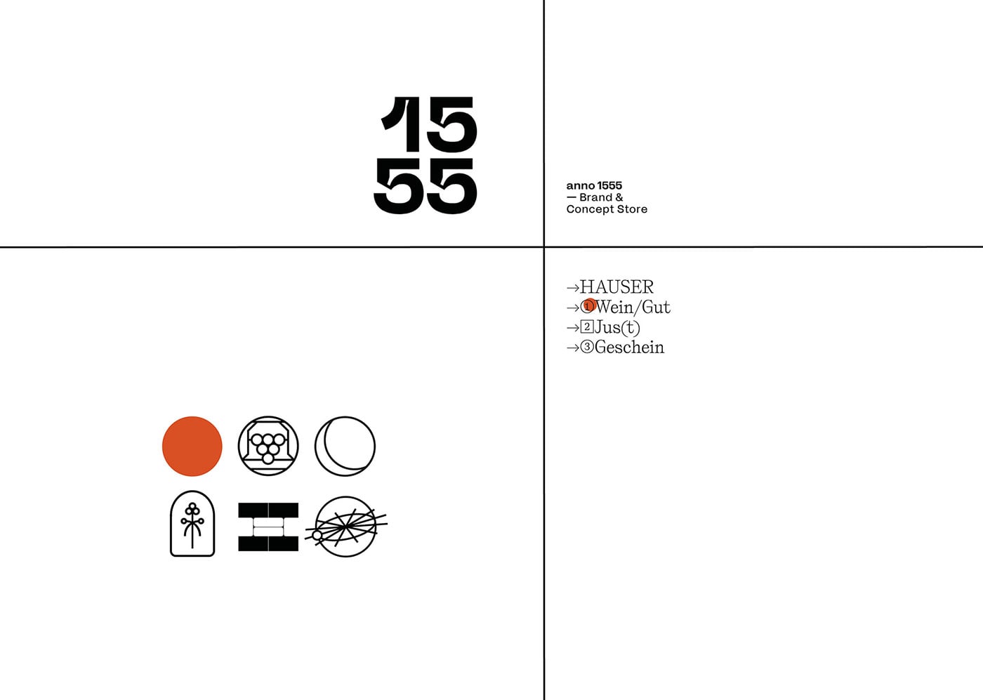 KR8 bureau designed ANNO 1555 - the new lifestyle brand of Austrian winemaker Hauser. The creative craftsman has recently introduced new, contemporary and urban products, all related to the topic of "The grape", such as uplifting Verjus–Sprizz "Jus(t)" or the delicate perfume "GESCHEIN". The brand of ANNO 1555 is a dadaist construct working with a dadaist system. Without a primary logo it introduces endless permeations with the sub brands iconography, two fonts that represent tradition and modernism, and a red dot as a pointer for the present.