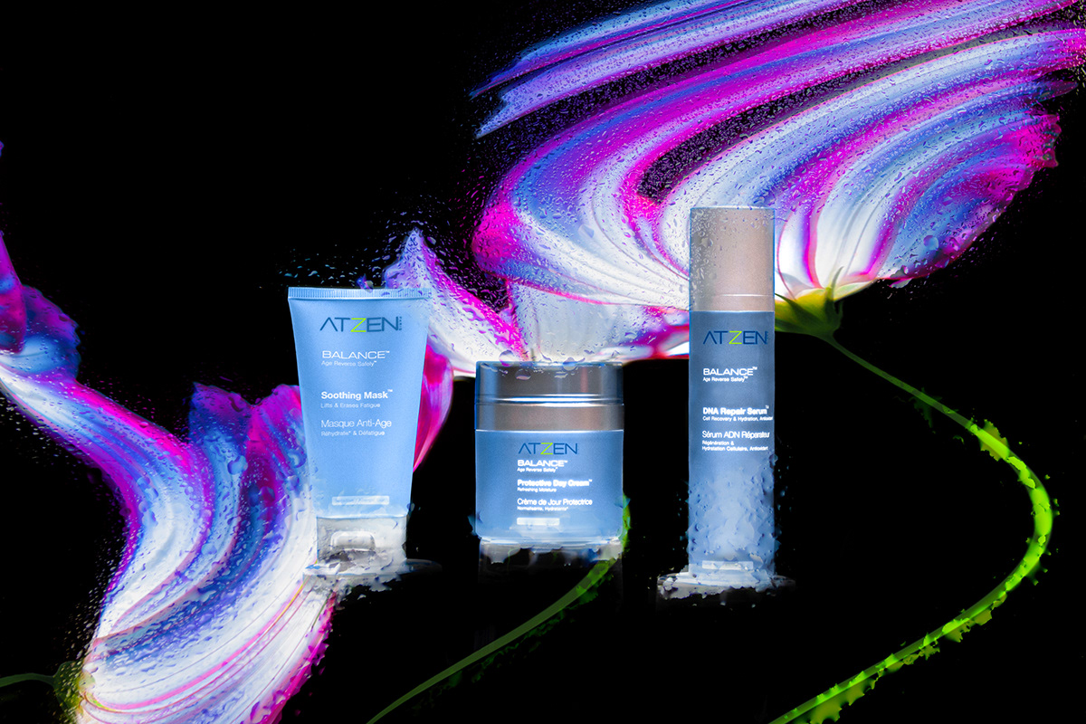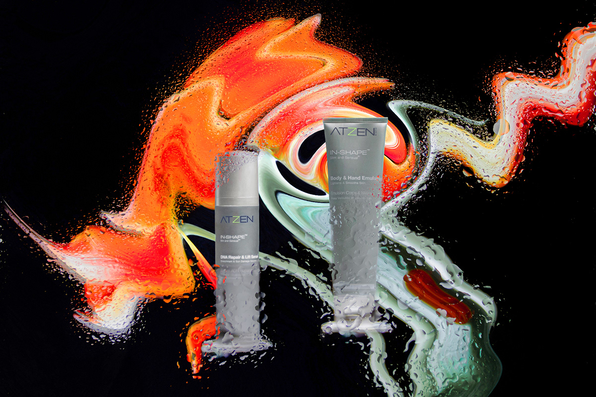 ESTEKOM designed ATZEN®️ - a cosmetics brand that is all about unique convergence of technology and nature. Scientific ingredients are combined with organic plants and vitamins. The designers decided to express this idea through linking artificial textures with real plants and flowers. To achieve such effect they used two types of editing – digital for the inimitable floral futuristic textures and analog to add sparkling water drops.