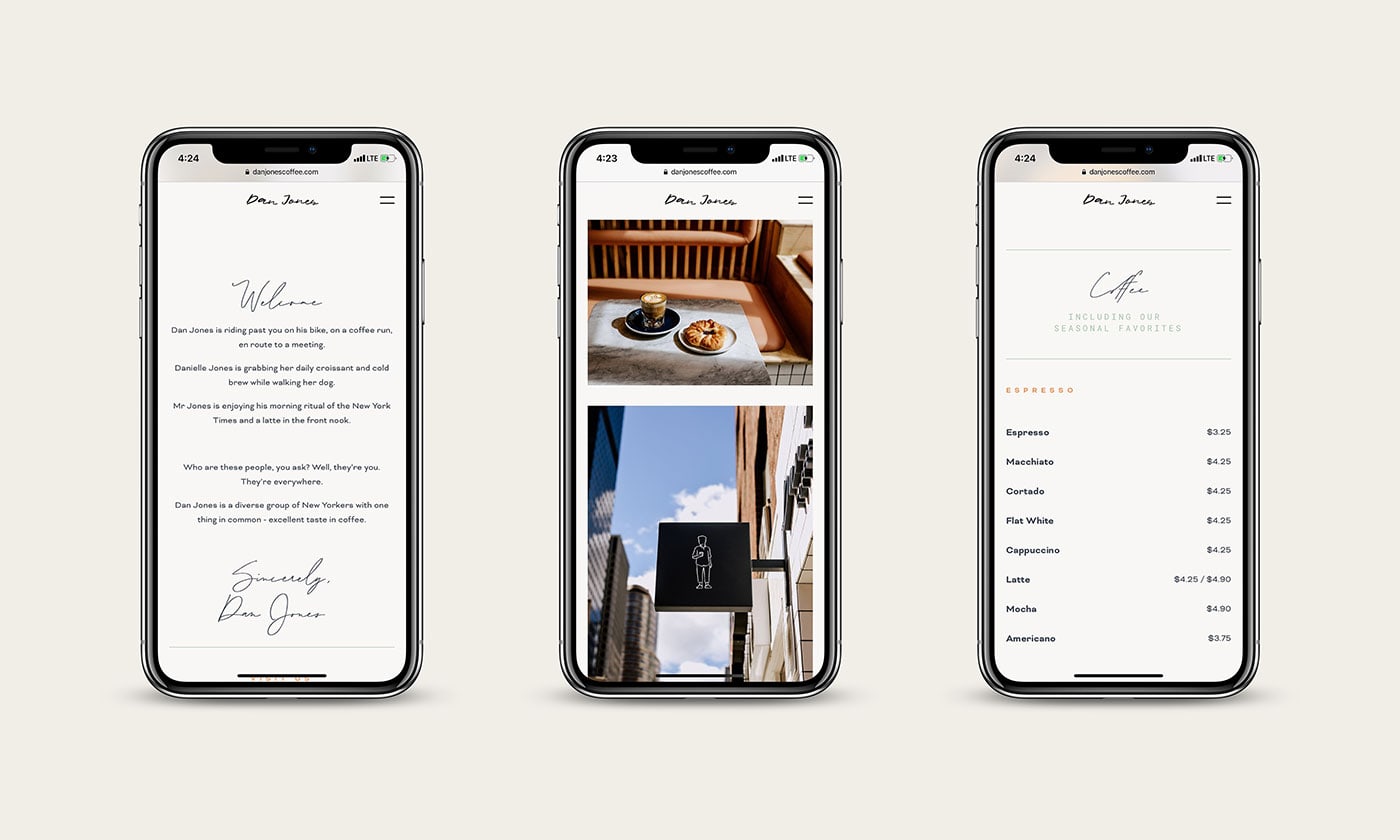 Crown Creative designed Dan Jones - a brand that evokes the feeling of a neighborhood coffee shop in the middle of bustling Midtown Manhattan.