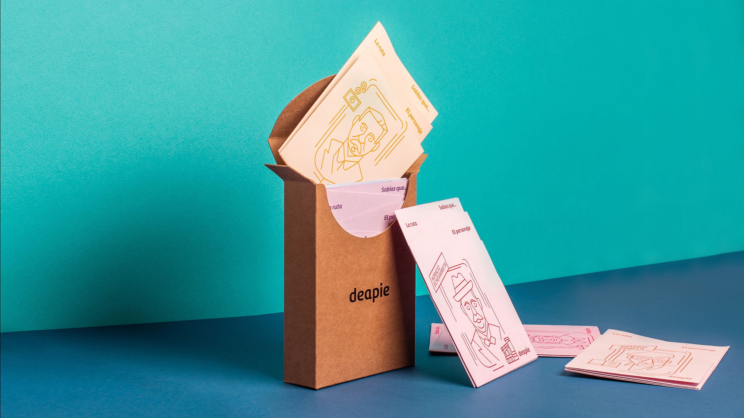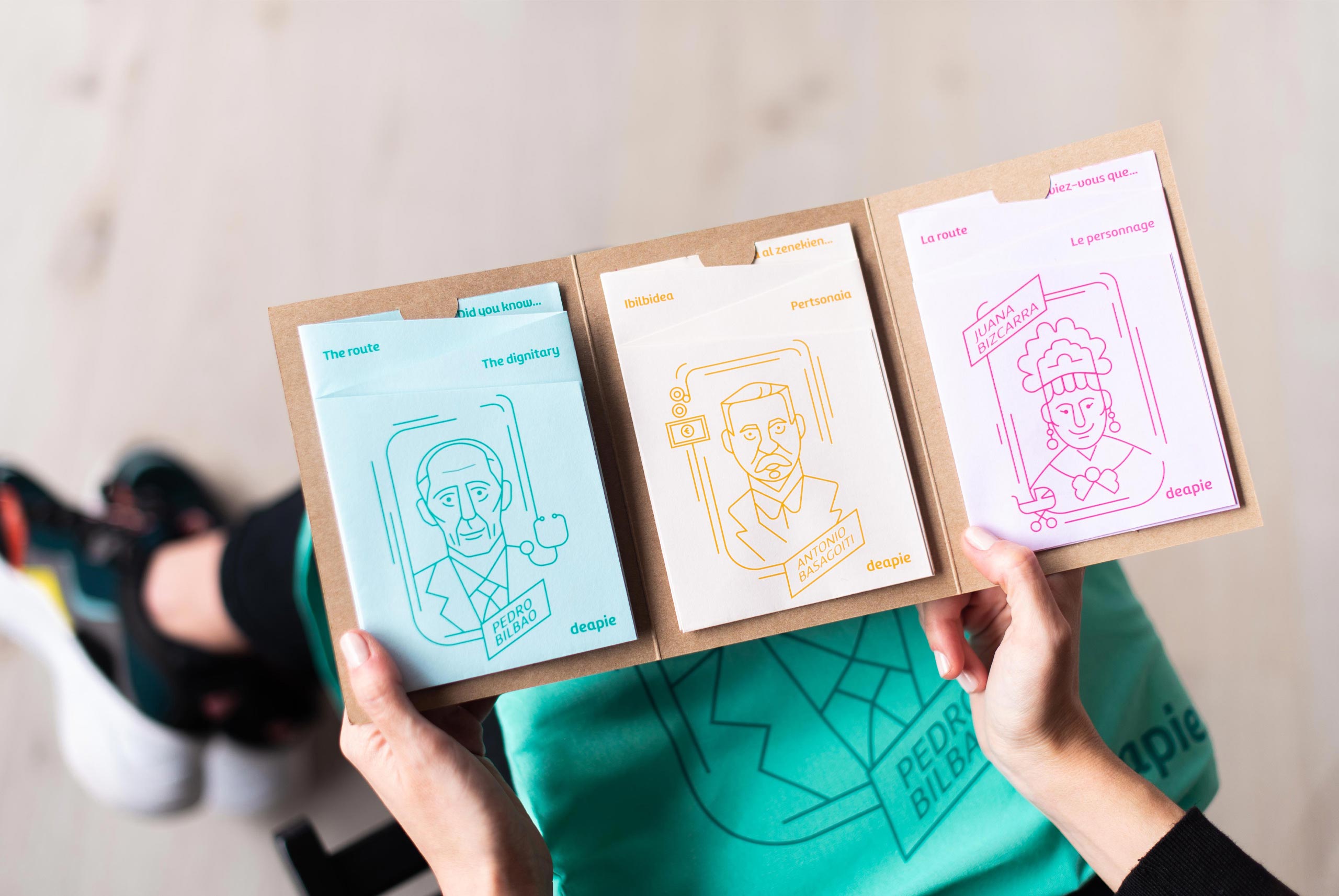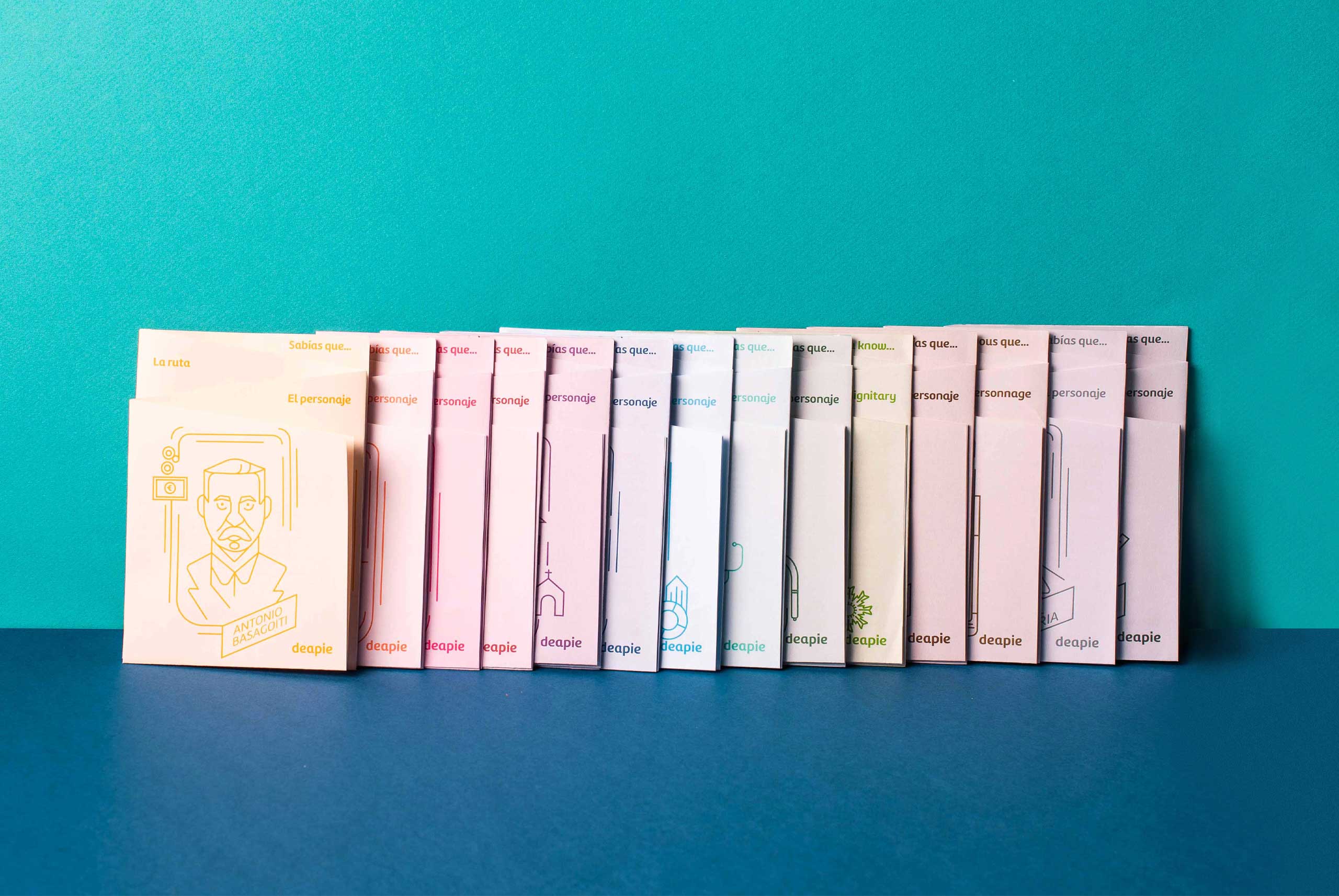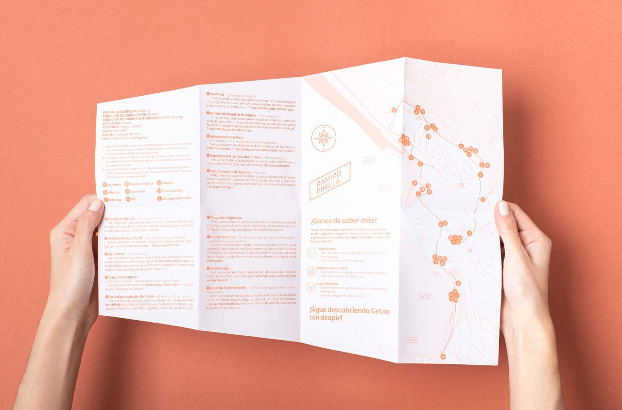 Estudio Marina Goñi designed Deapie - special walking routes collection. This project is a highly ambitious and innovative project for the tourism sector. It consists on a collection of 14 walking routes inspired by 14 famous people from the village of Getxo (Bizkaia, Spain). Each character´s life and legacy inspires each walking route and underlines a theme: architecture, urban planning, nature…