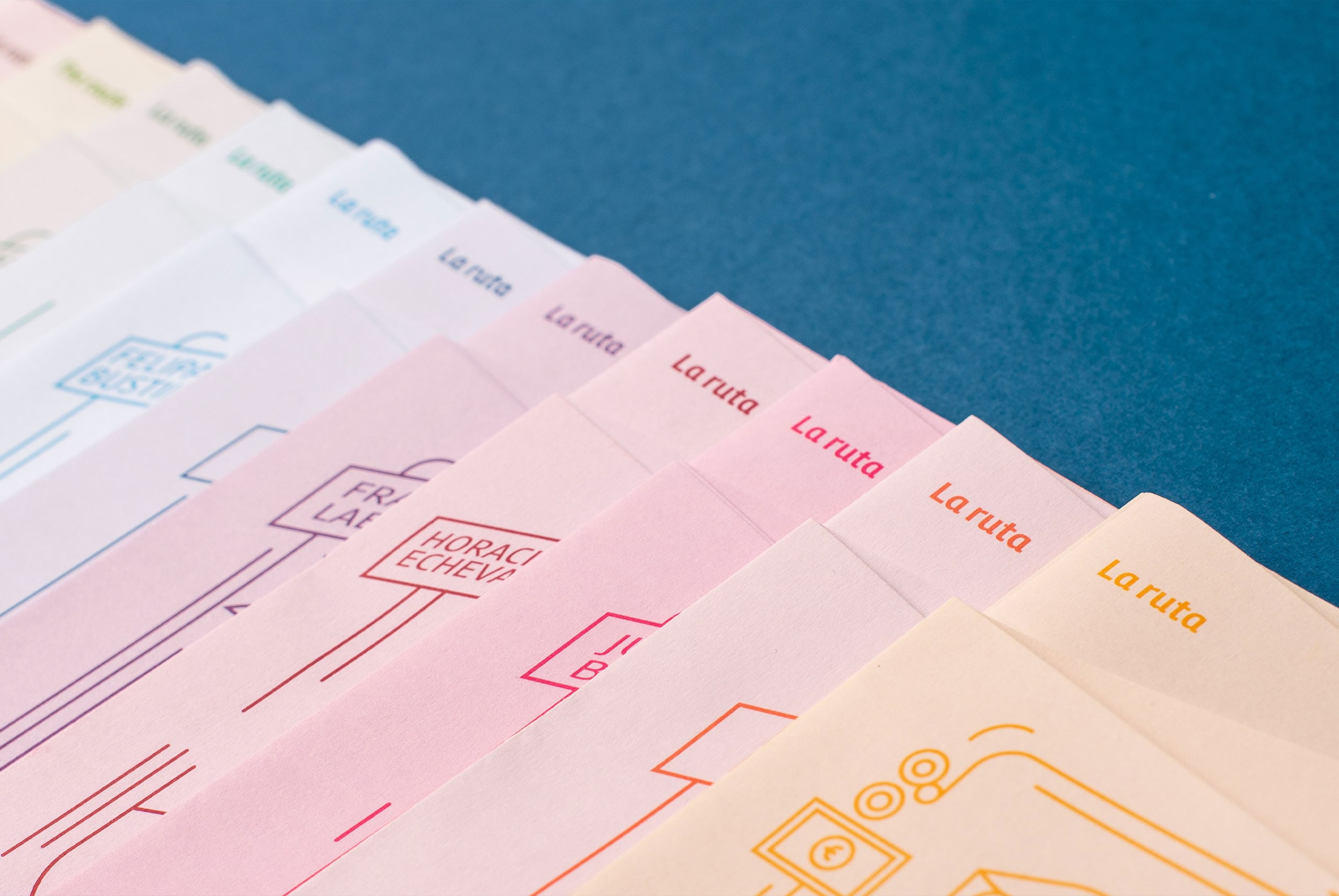 The project consist on creating the naming in spanish, and design the visual universo and the maps. Visually speaking, a colourful collection of 14 maps with linear illustrations and flat colours. The special touch is the systems designed to highlight different sections within each map. To complete the experience there is a piece to hold 3 maps. A brochure to place the maps in, facilitating carrying them and being able to generate groups of three routes. To complete the set, there is a container box available for collectors and walkers.