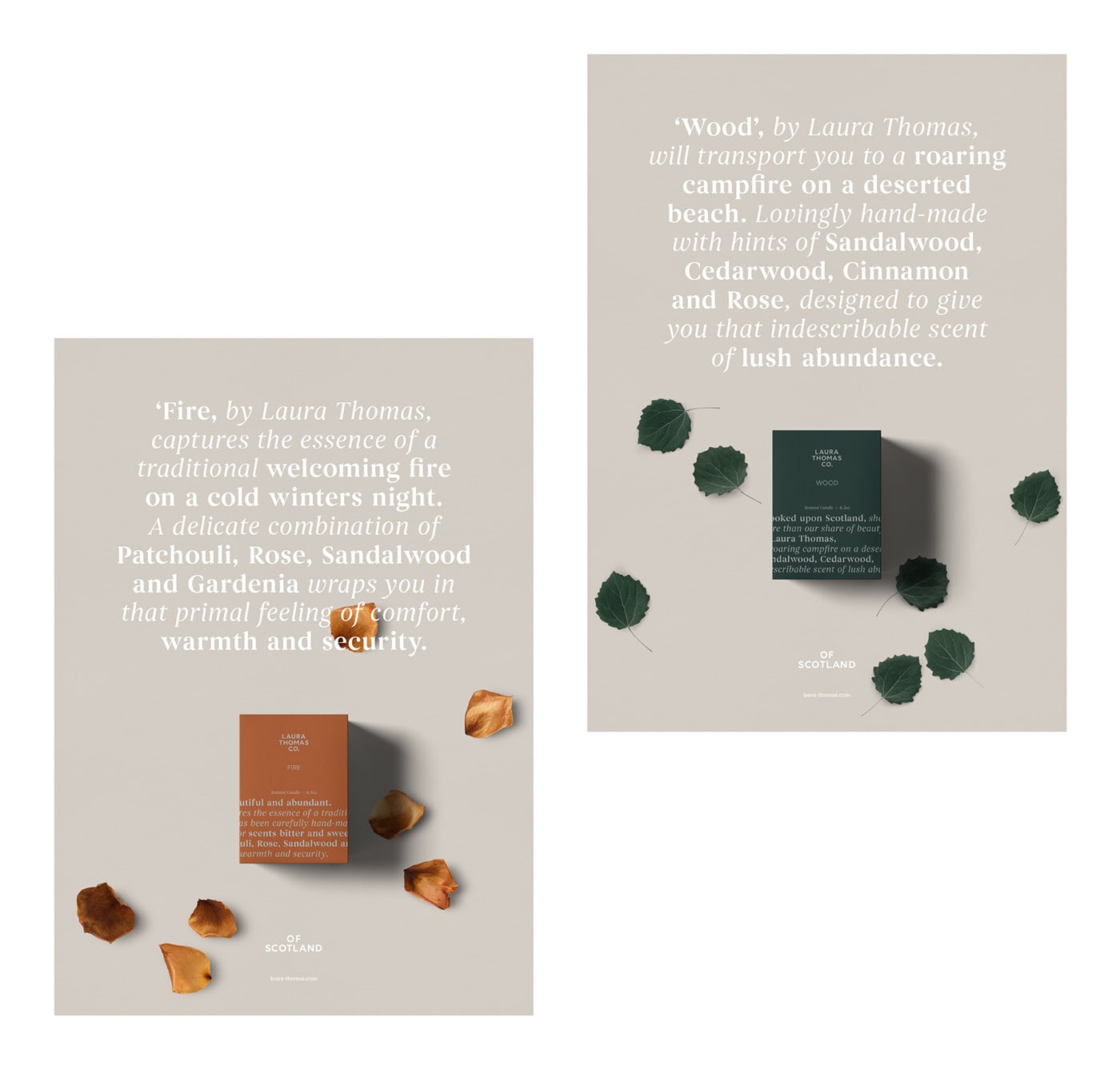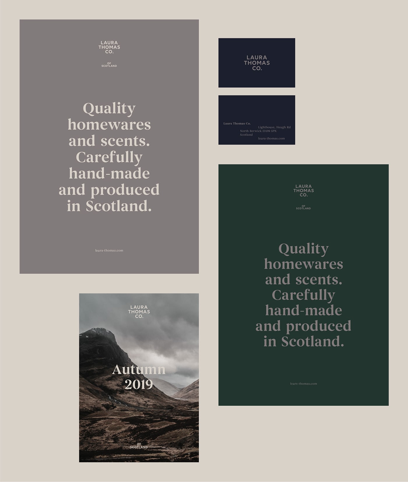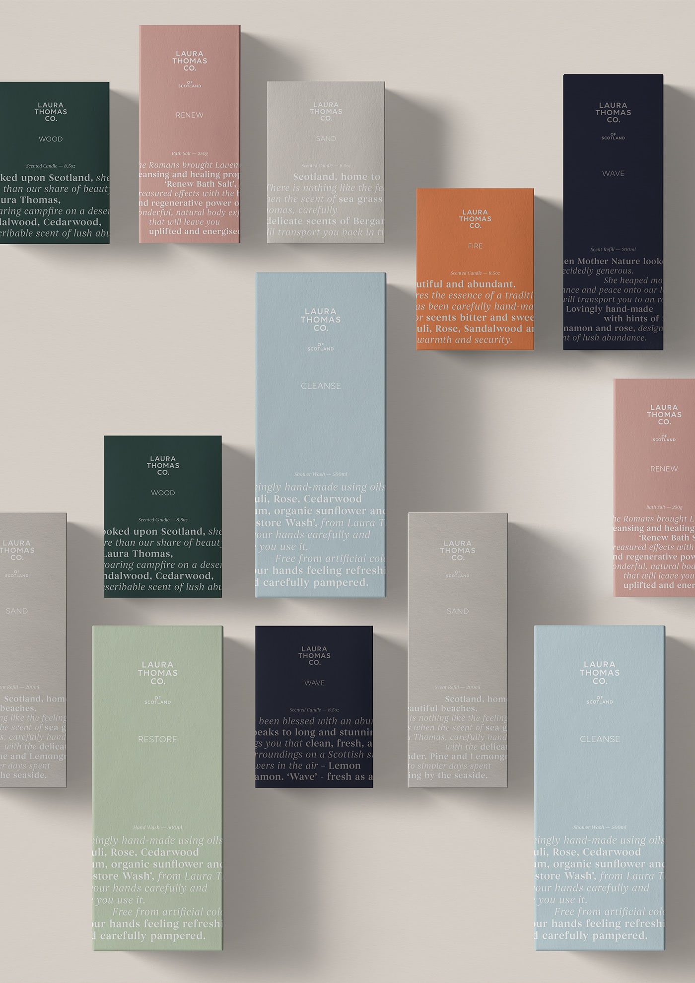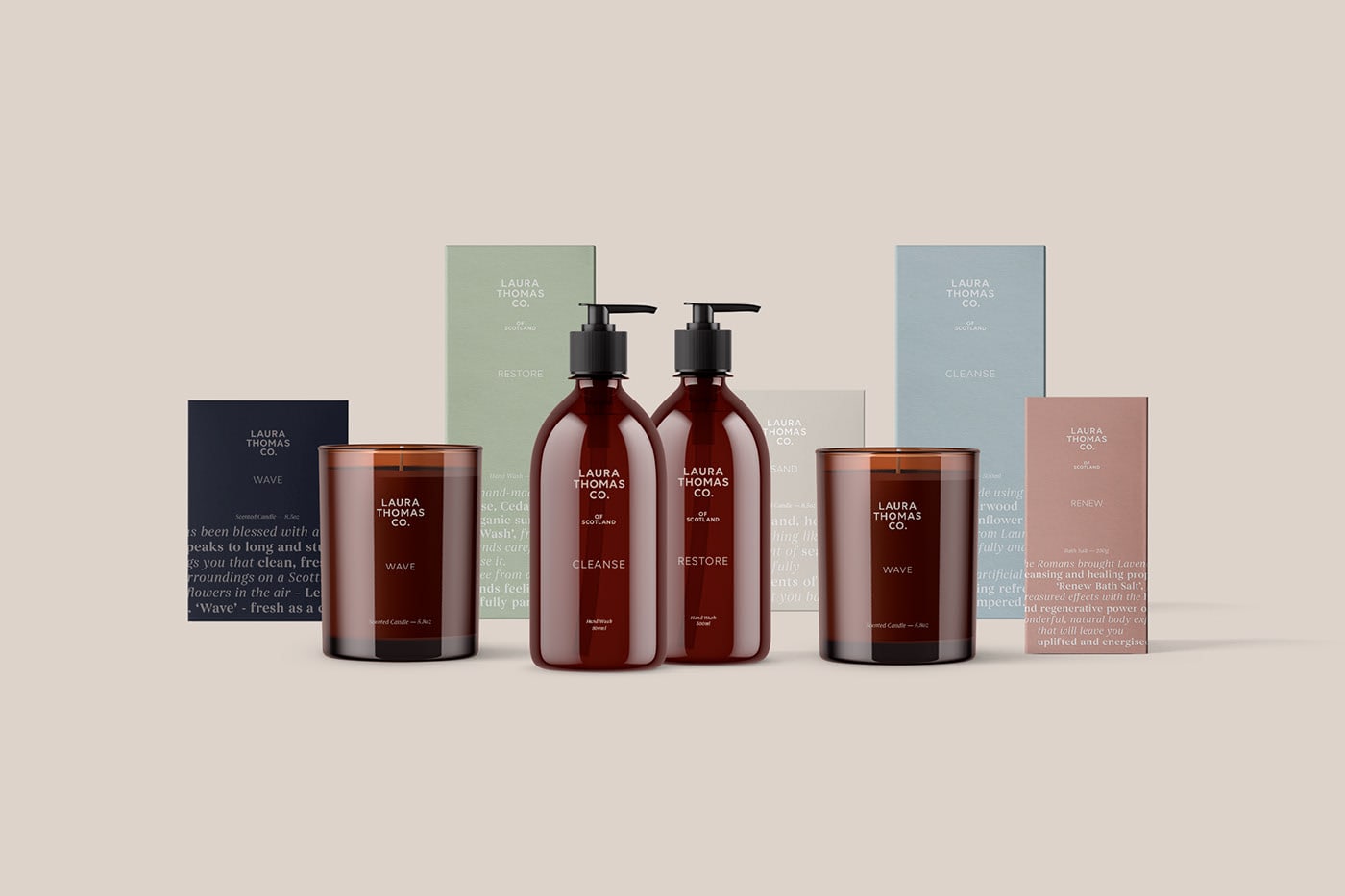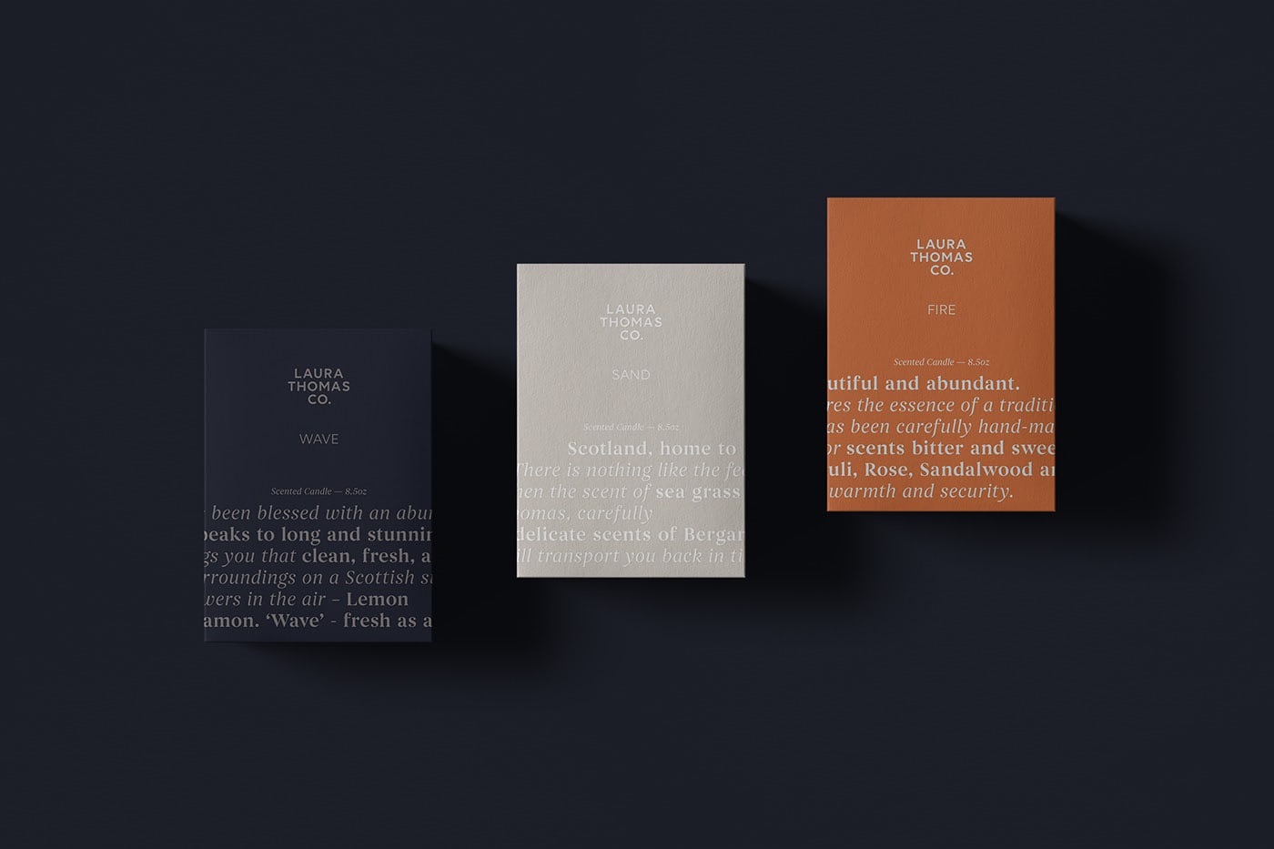 designed Laura Thomas Co. - a brand based in Scotland, that produces hand-made, all-natural scents, body care products and homewares. They worked closely with Laura to update her brand identity and develop a new packaging range.
