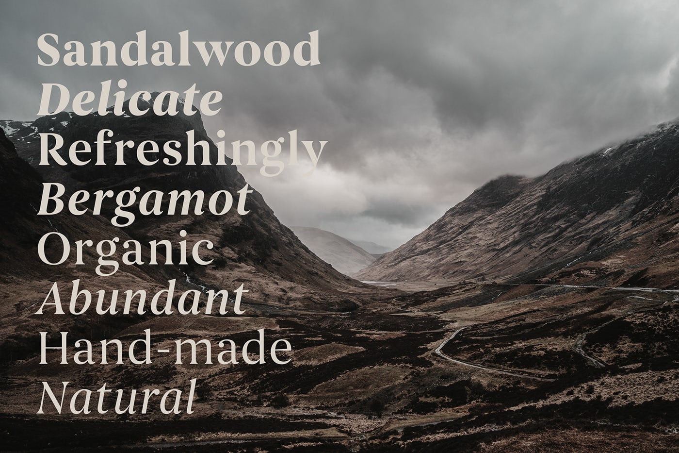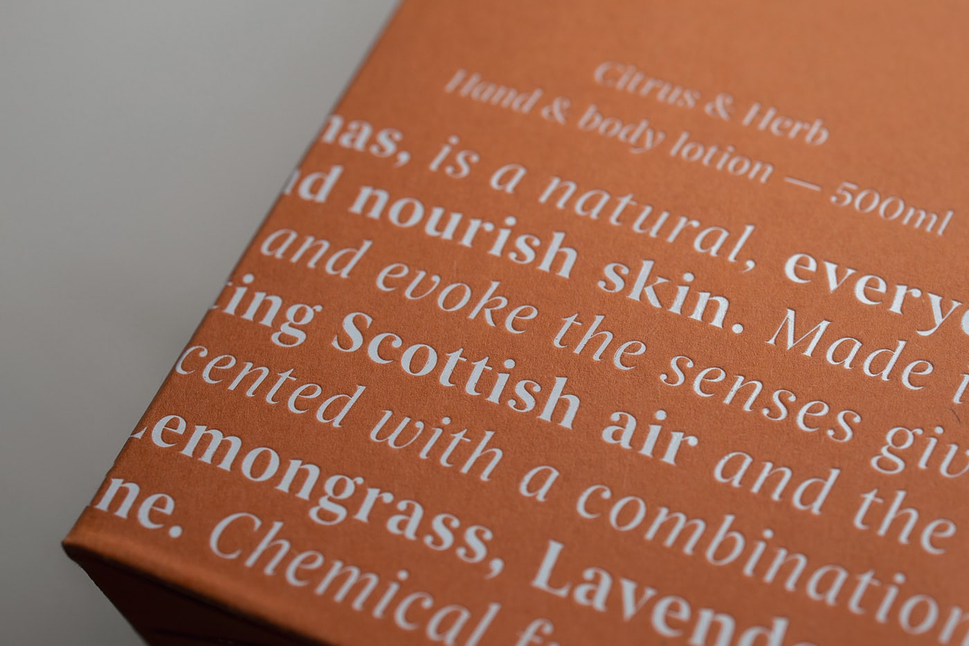The key focus was to bring the story of the product origin to life in the expression of the packaging, referencing both the natural ingredients and the Scottish heritage. A simple, unique story was written for each product expressing the inspiration and origin of the ingredients and the mood they should evoke. The stories were then wrapped around each box in large text, adding an inviting, tactile experience that became the signature element of the Laura Thomas Co. packaging range.