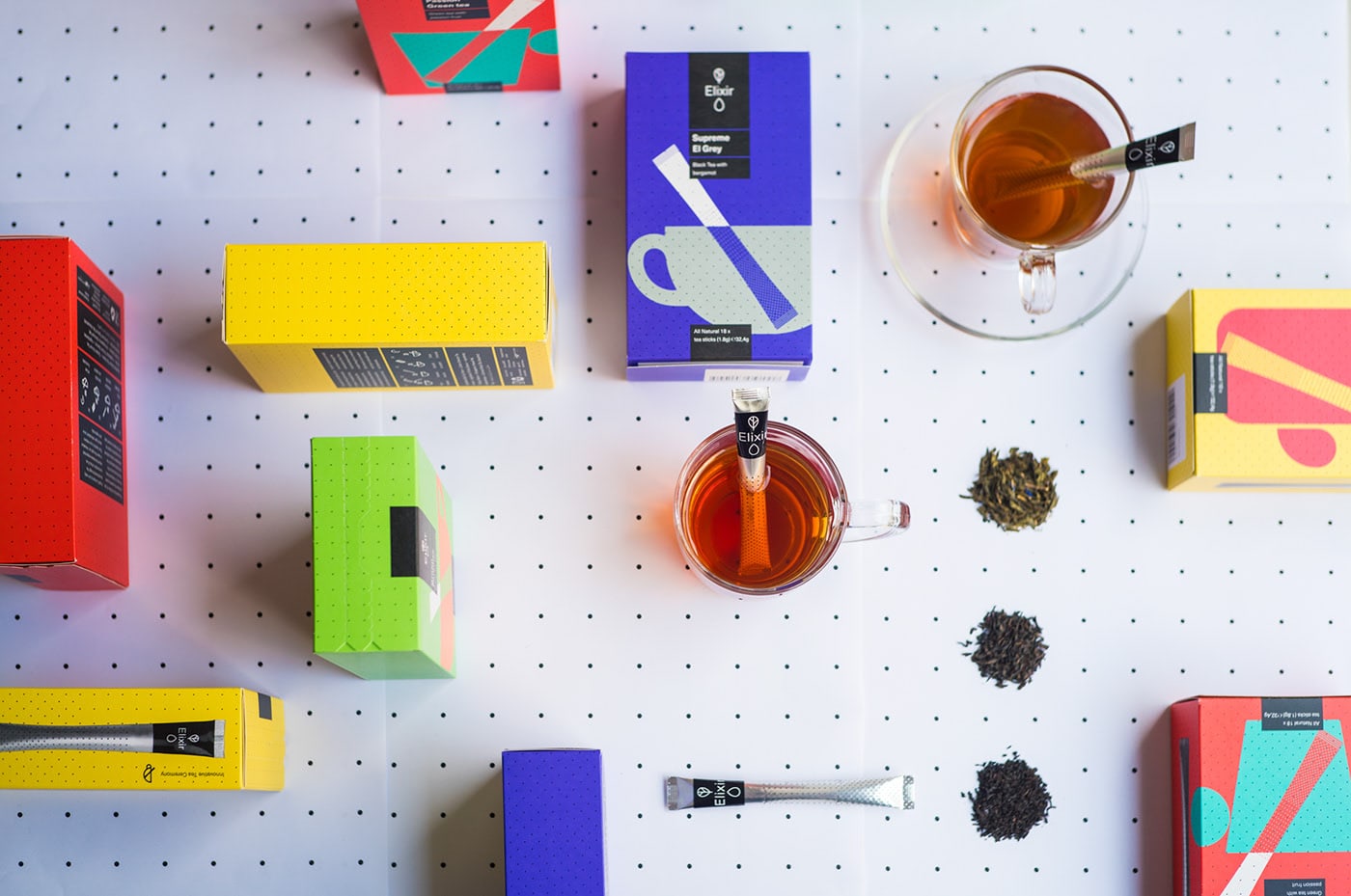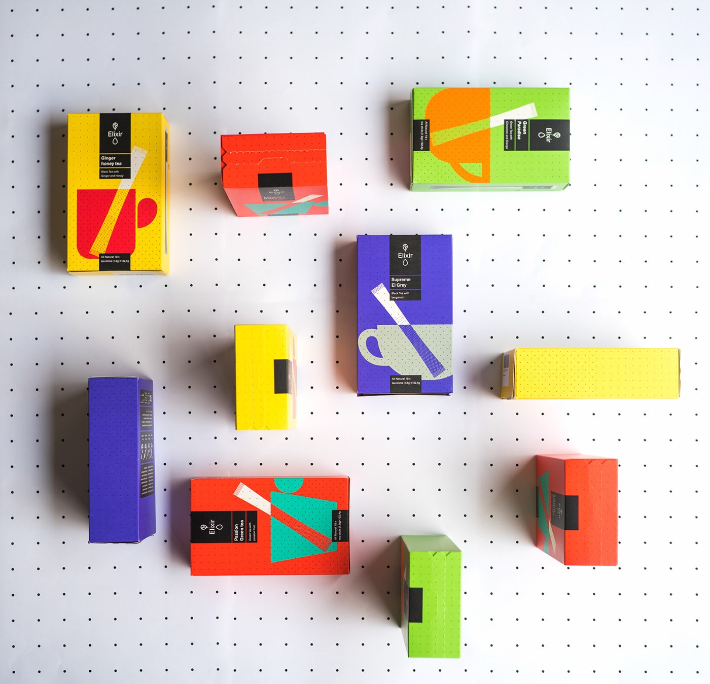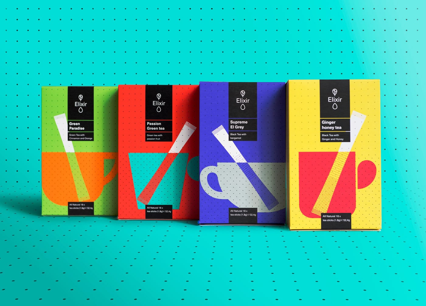 Typical Organization designed Typical Organization. For our Athens based client Elixir tea we have tried to translate classic principals from the monumental tea culture in a new grid based tea ceremony. A dotted grid, inspired by the Elixir's tea stick perforation, is used to assure a modernistic harmony & order promoting the purifying, calming and energising effects of the teas. The new ceremony is preformed in the 3D projecting rooms of our contemporain lifestyle where we have a renewed relation with time and space, making an attempt to render the emerging virtual space into a real time heavy contrasted tea experience. In a few words of Theo van Doesburg : '… art and life are no longer separate domains.