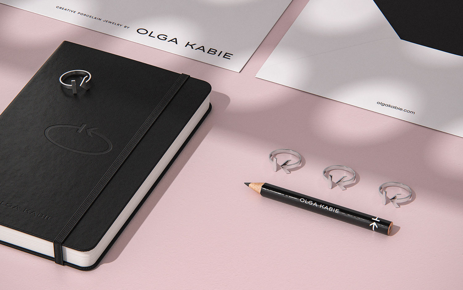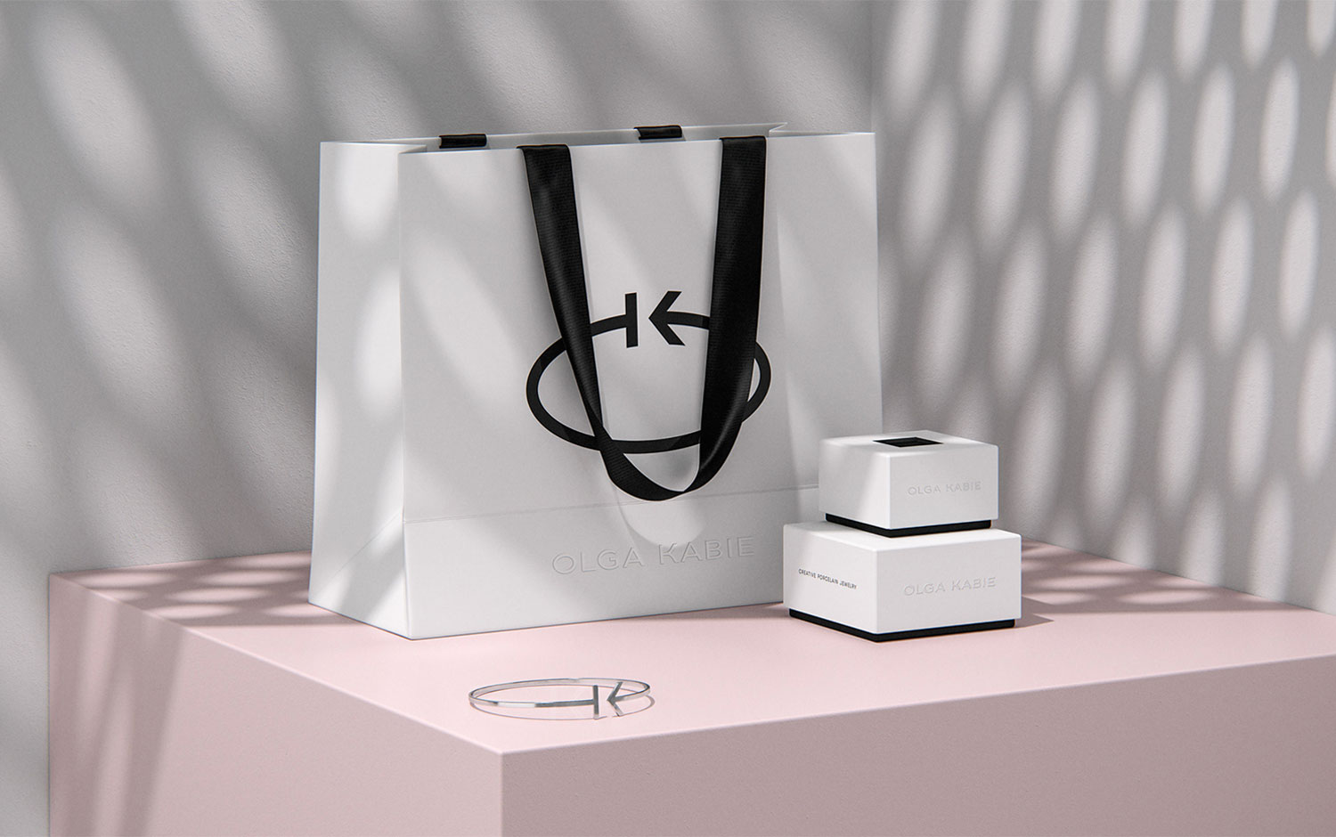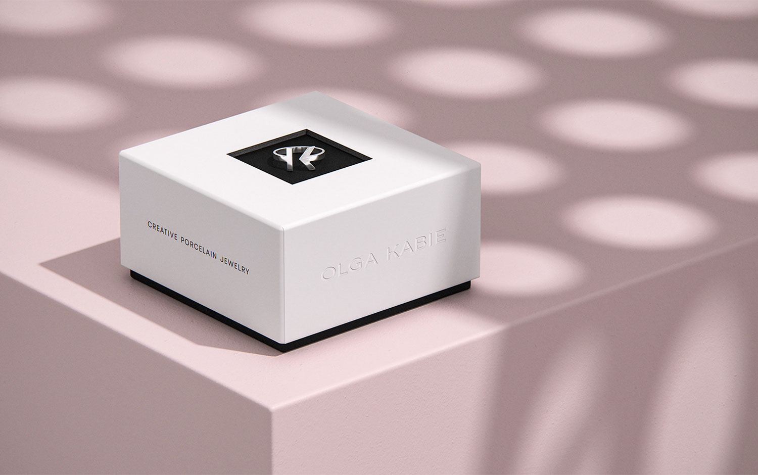 Olga Kabie identity consists mainly of a monogram formed as a ring, which has become the symbol of the brand. It includes stylized letters O and K, Olga's initials. Its laconic form is the mark for jewelry pieces, which was a crucial client requirement. In addition, the symbol became a line of signature silver rings and bracelets. The form, texture, and color of jewelry pieces were the sources of inspiration for the line of minimalistic packaging. It reflects the brand’s philosophy and emphasizes the delicate grace of jewelry and its morphological cleanness. Also, the presentation itself has an elegant and naive look, but the steel products and logo's sharp angles create a genderless aesthetic with a very modern style.