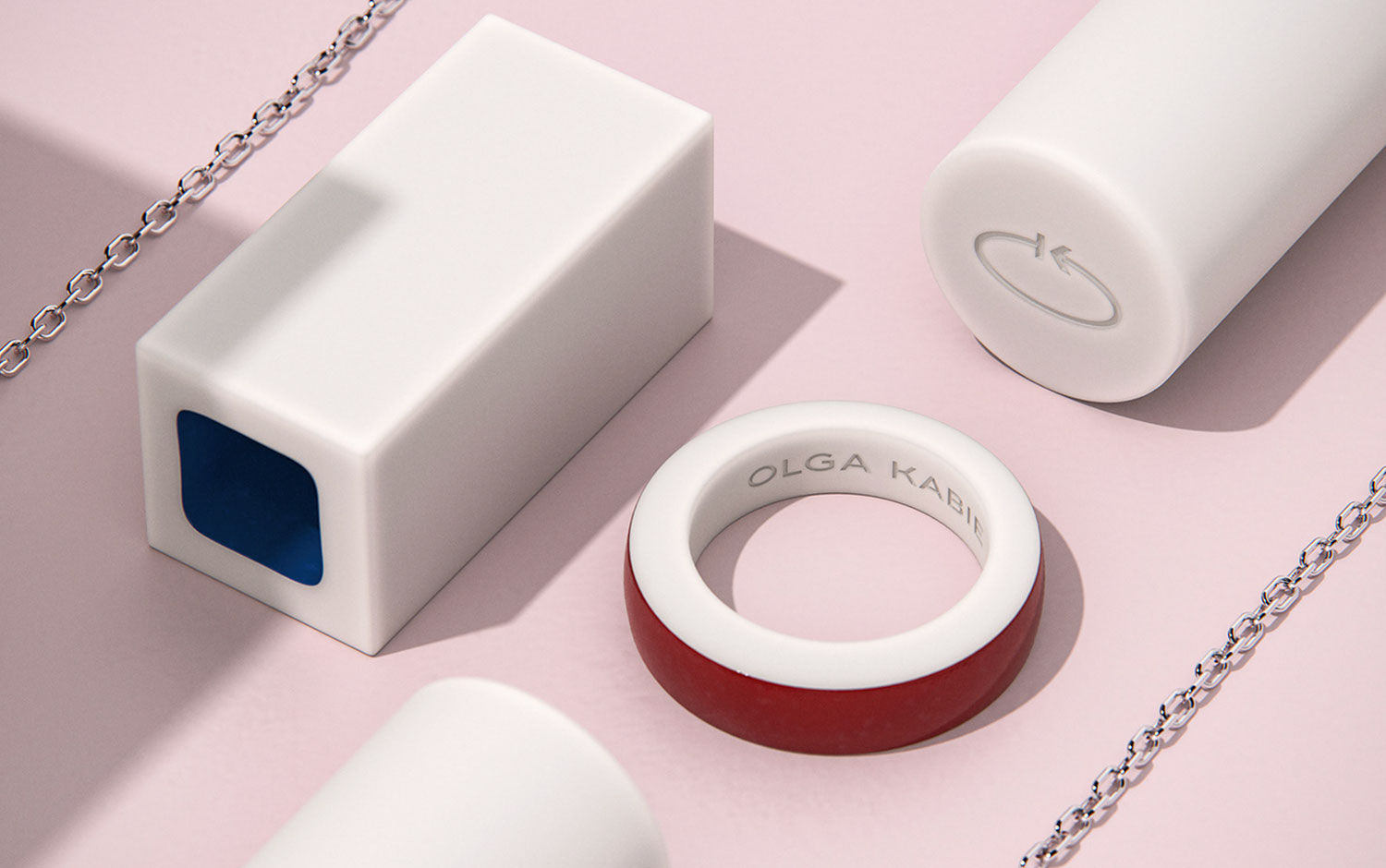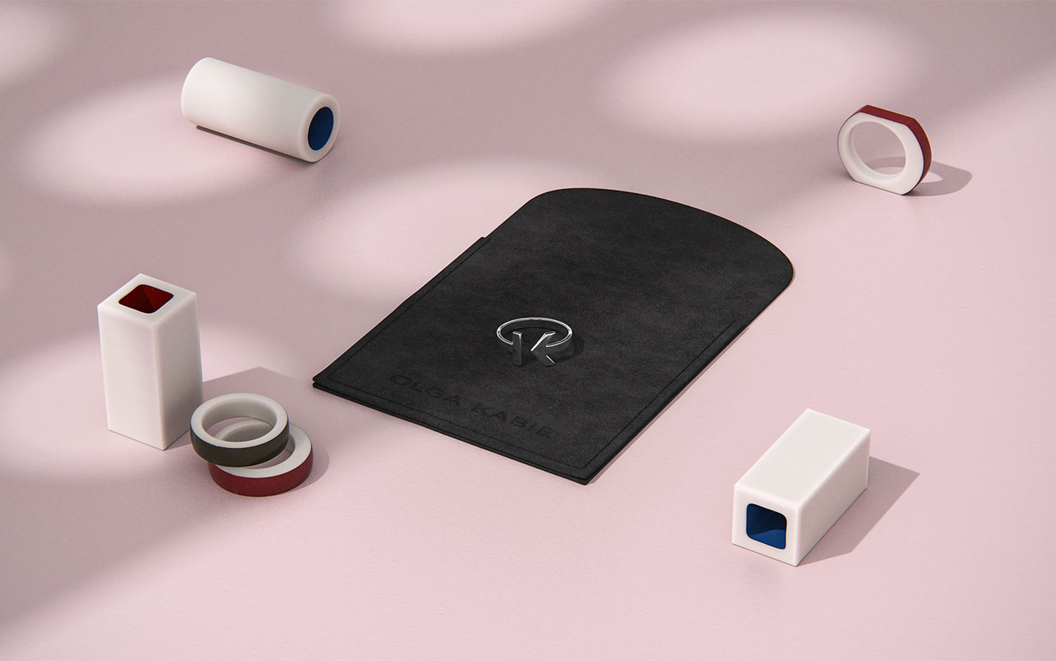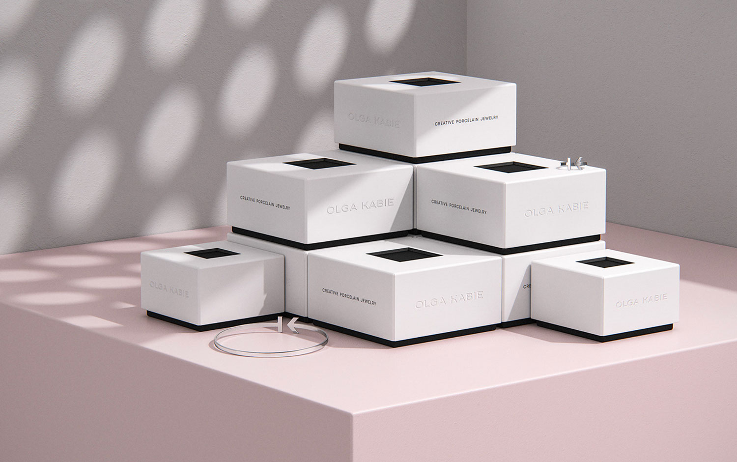 Olga Kabie identity consists mainly of a monogram formed as a ring, which has become the symbol of the brand. It includes stylized letters O and K, Olga's initials. Its laconic form is the mark for jewelry pieces, which was a crucial client requirement. In addition, the symbol became a line of signature silver rings and bracelets. The form, texture, and color of jewelry pieces were the sources of inspiration for the line of minimalistic packaging. It reflects the brand’s philosophy and emphasizes the delicate grace of jewelry and its morphological cleanness. Also, the presentation itself has an elegant and naive look, but the steel products and logo's sharp angles create a genderless aesthetic with a very modern style.
