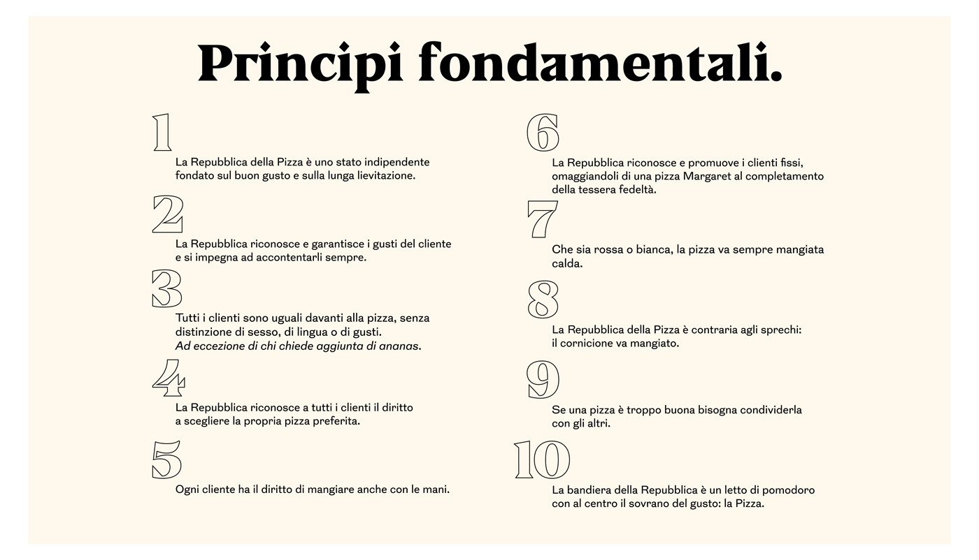 The designer was commissioned to design the whole identity, since the concept to the interior design, with the complete materials selection and applications. He created a short Repubblica constitution, like a real independent state, with its own rules.