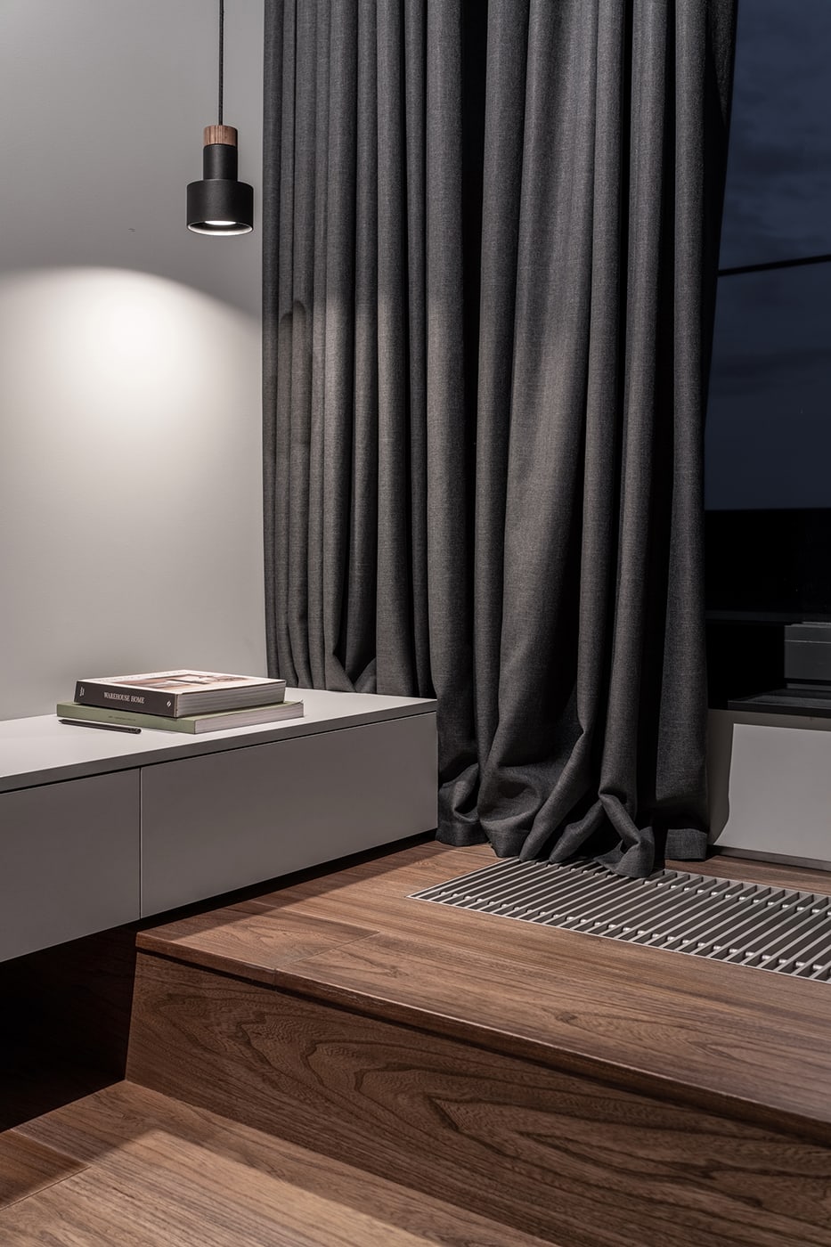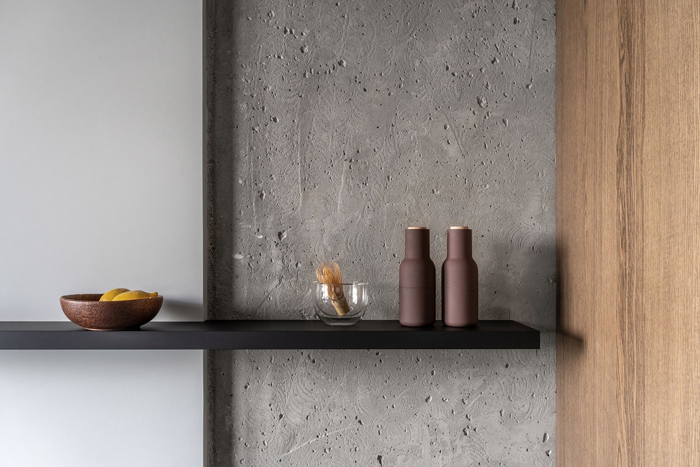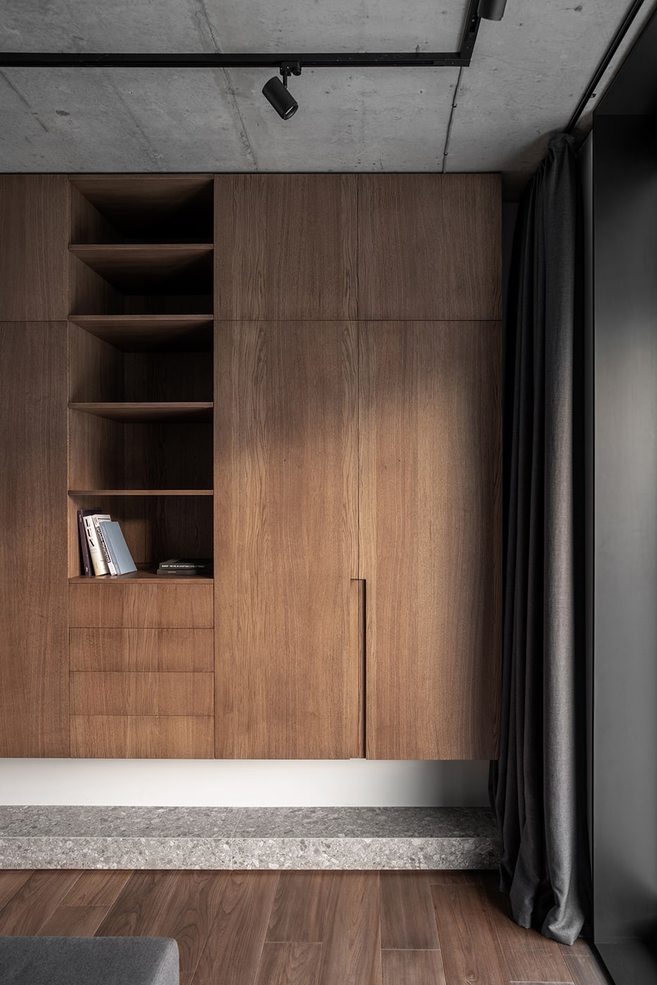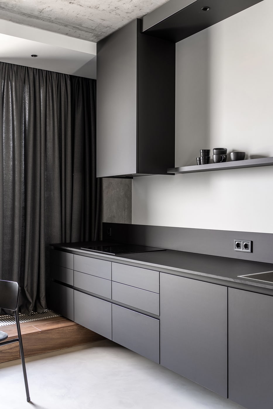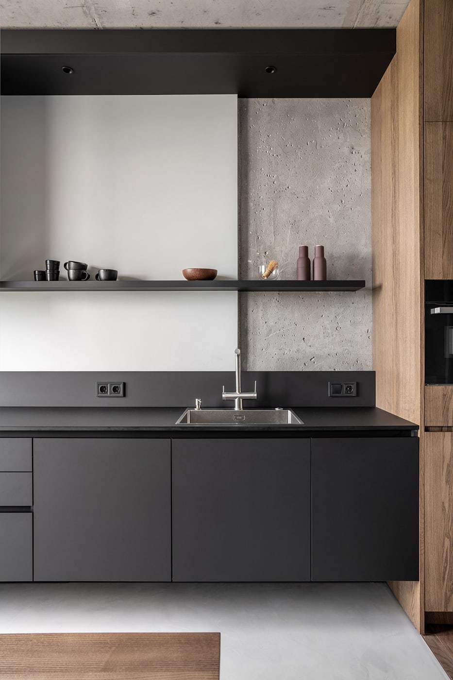 The color palette is composed predominantly of monochromatic tones. Grey tints in combination with genial dimmed brown oak shades deliver a subtle perception of restful mood. The black kitchen takes all responsibility for a major input in the color scheme.