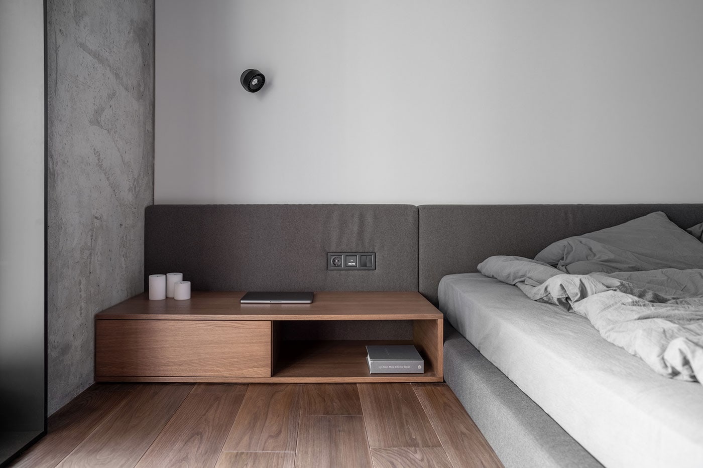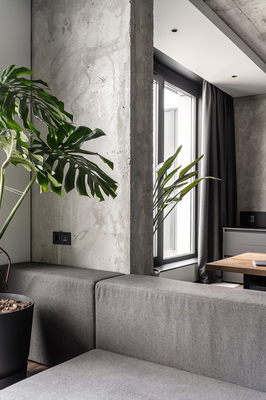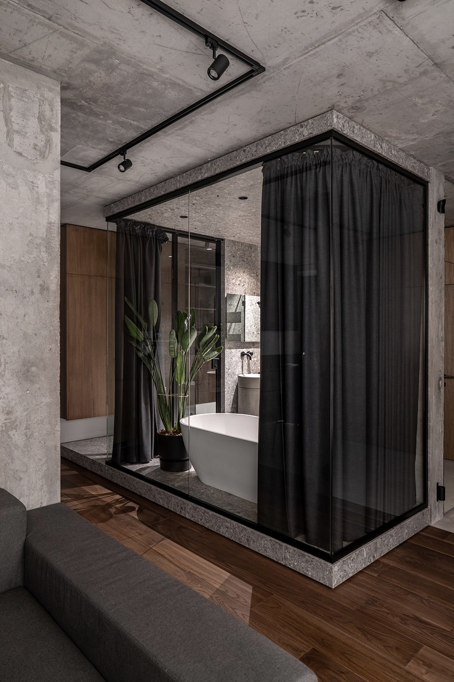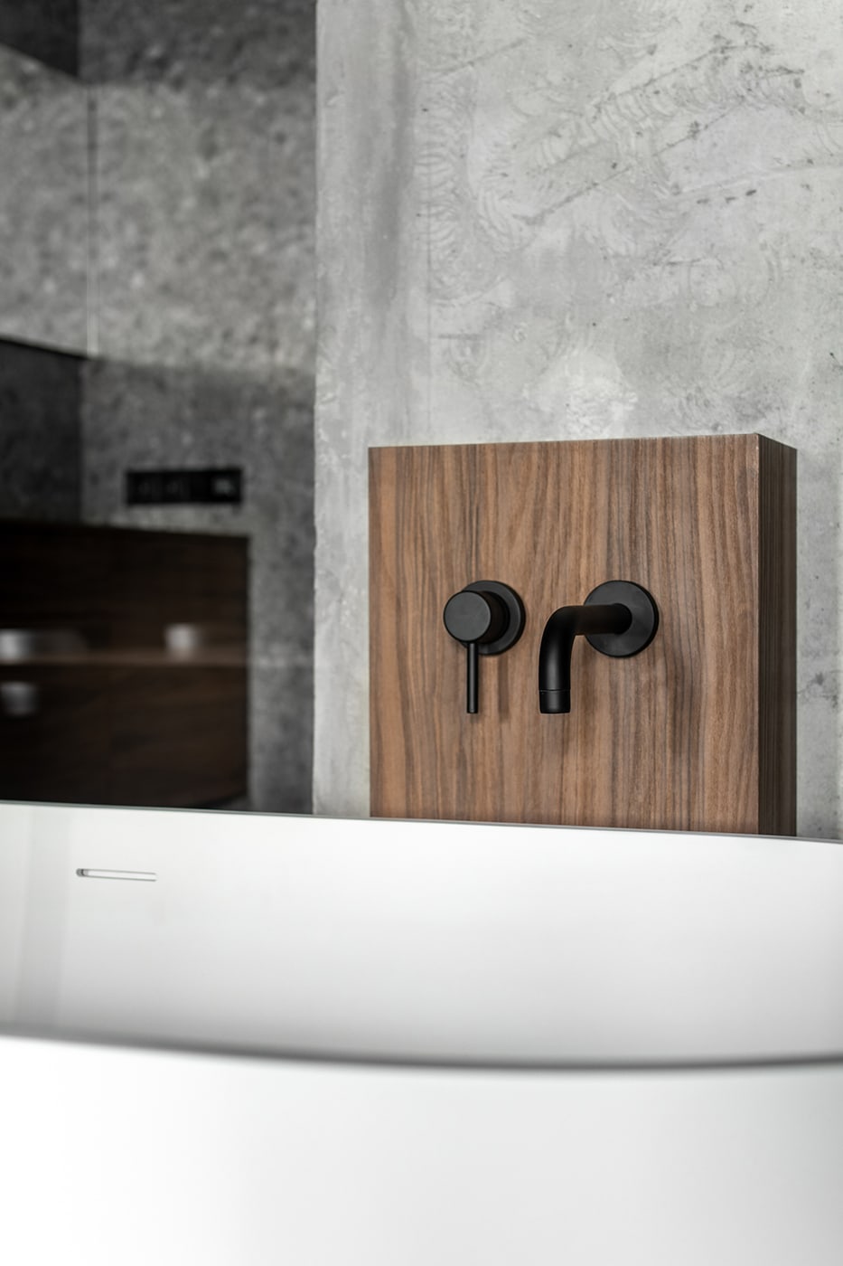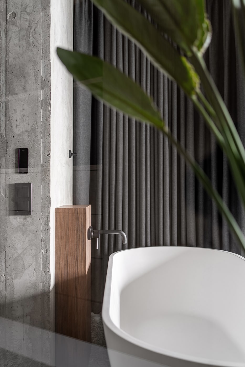 The color palette is composed predominantly of monochromatic tones. Grey tints in combination with genial dimmed brown oak shades deliver a subtle perception of restful mood. The black kitchen takes all responsibility for a major input in the color scheme.