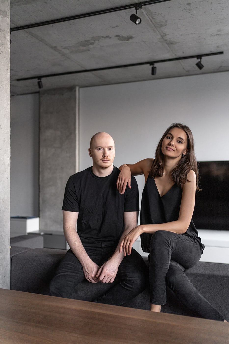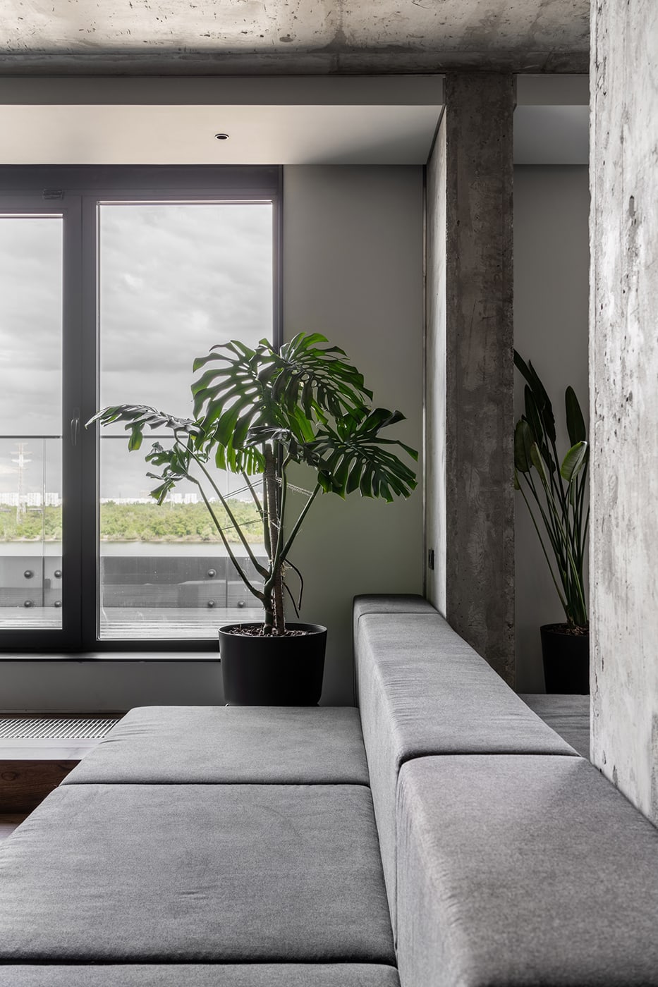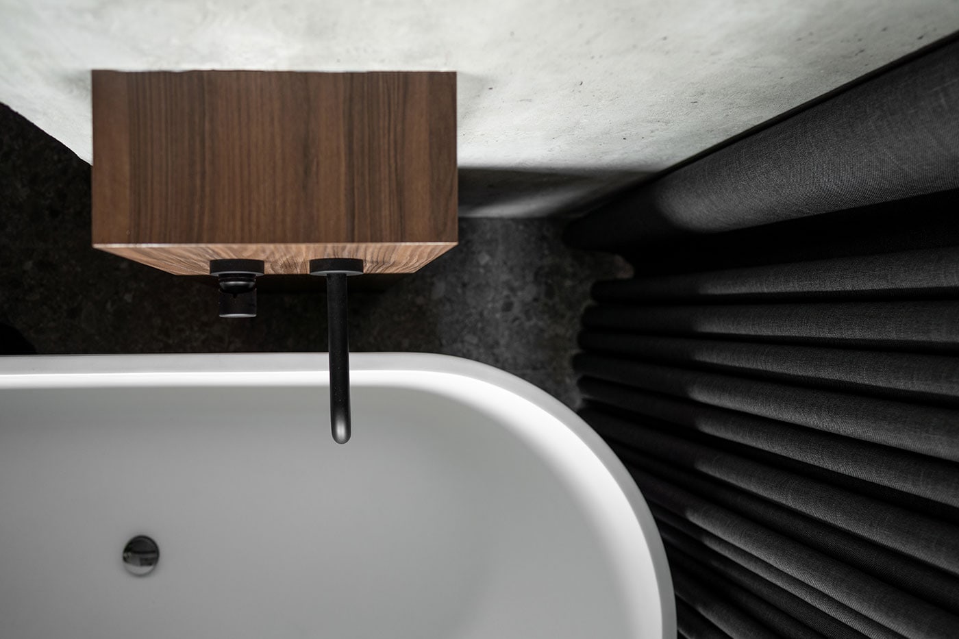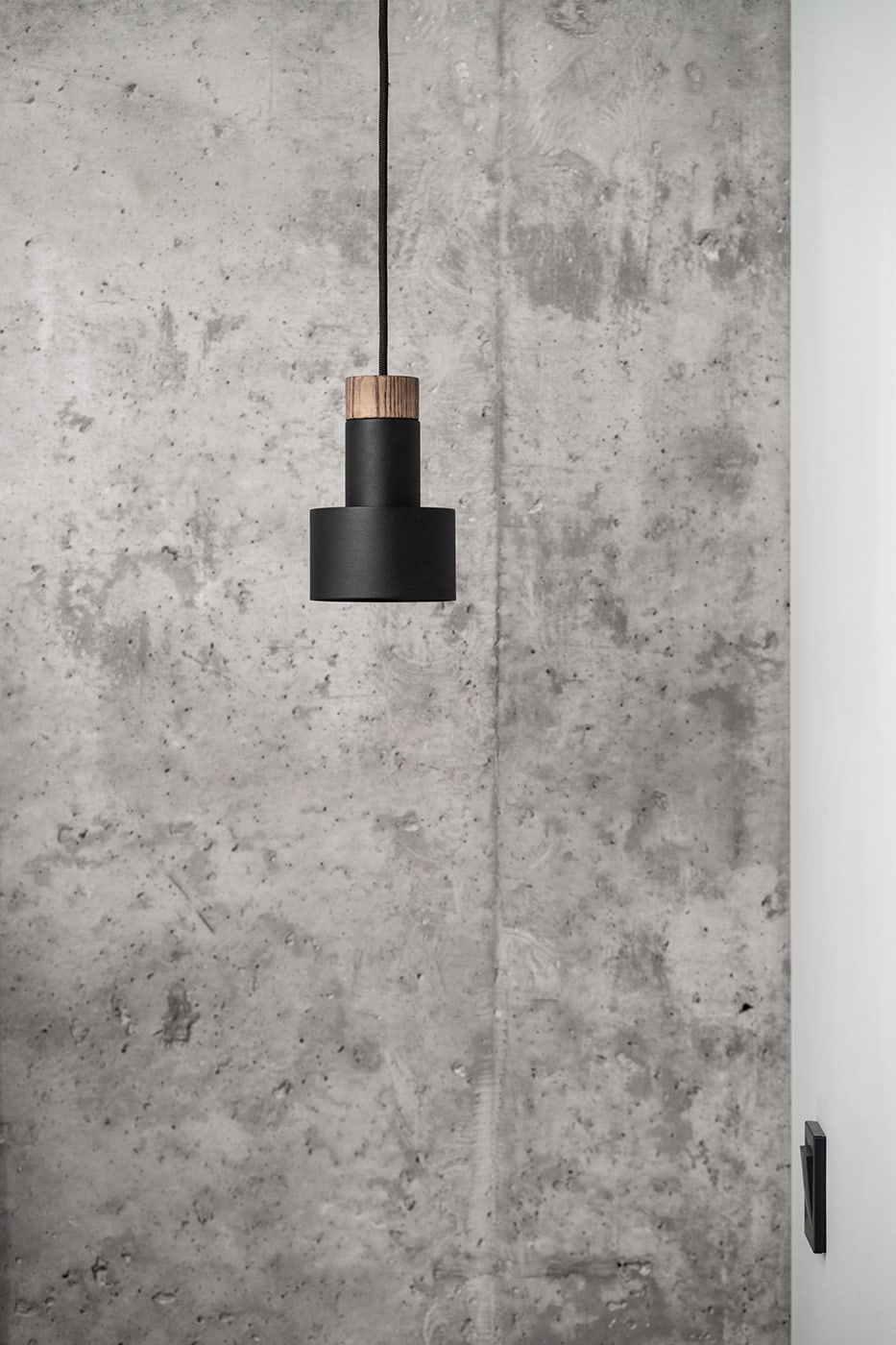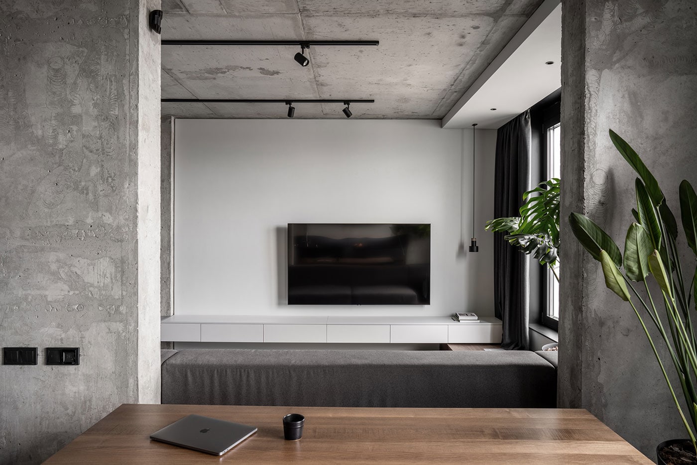 The color palette is composed predominantly of monochromatic tones. Grey tints in combination with genial dimmed brown oak shades deliver a subtle perception of restful mood. The black kitchen takes all responsibility for a major input in the color scheme.