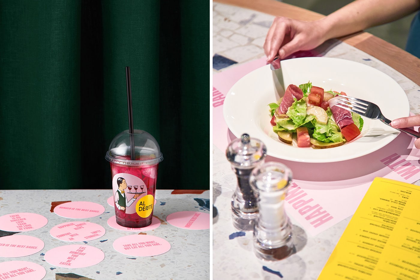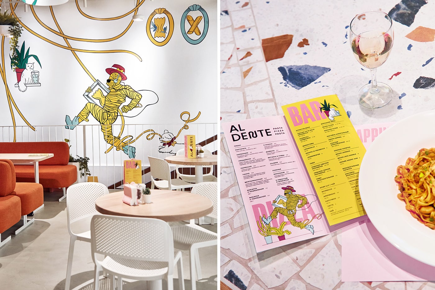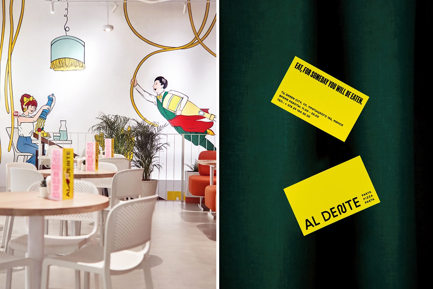 Fabula Branding designed Al Dente Restaurant. The first bistro of the Al Dente chain opened in Minsk in spring 2019. The company specializes in homemade Italian food. The cooking is fast due to the simplicity of recipes, and excellent taste is guaranteed by the quality and combination of ingredients. The menu was developed by the famous Italian chef Ignacio Rosso.