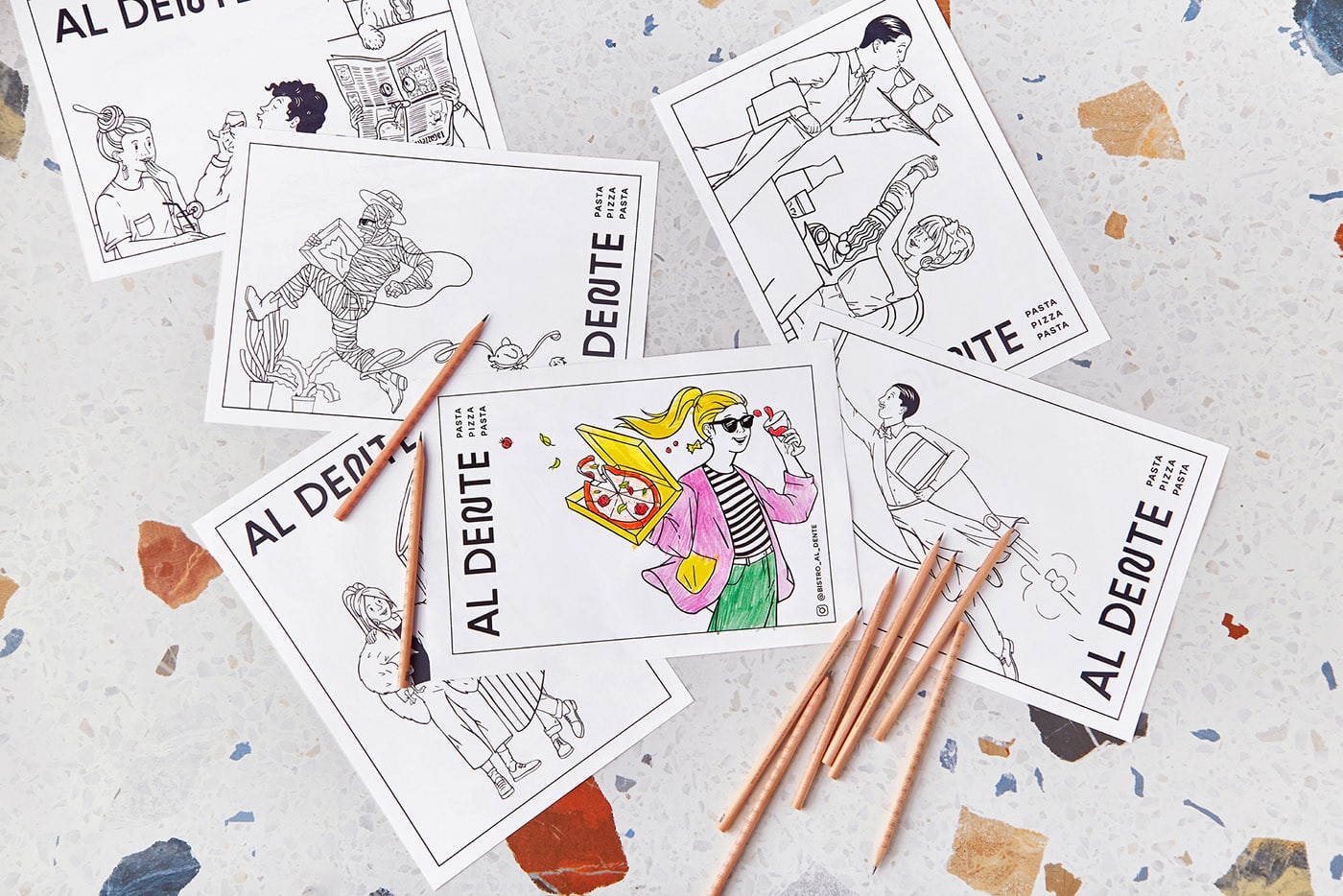 Customized sketch-like illustrations help the customers feel the atmosphere of Italy. Located in the areas with the best lighting as well as in the entrance area, they attract attention without overloading the visitors with information. The same illustrations are used in the design the the menus, pizza and pasta packages, stickers, and colouring books for the children. All points of contact with the brand help the customer get fully submerged into its atmosphere.