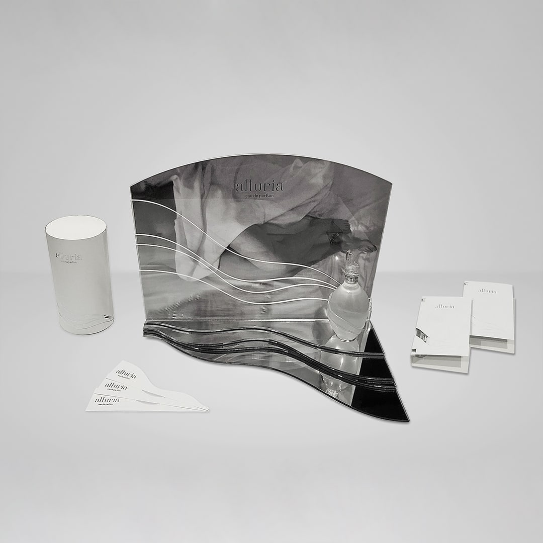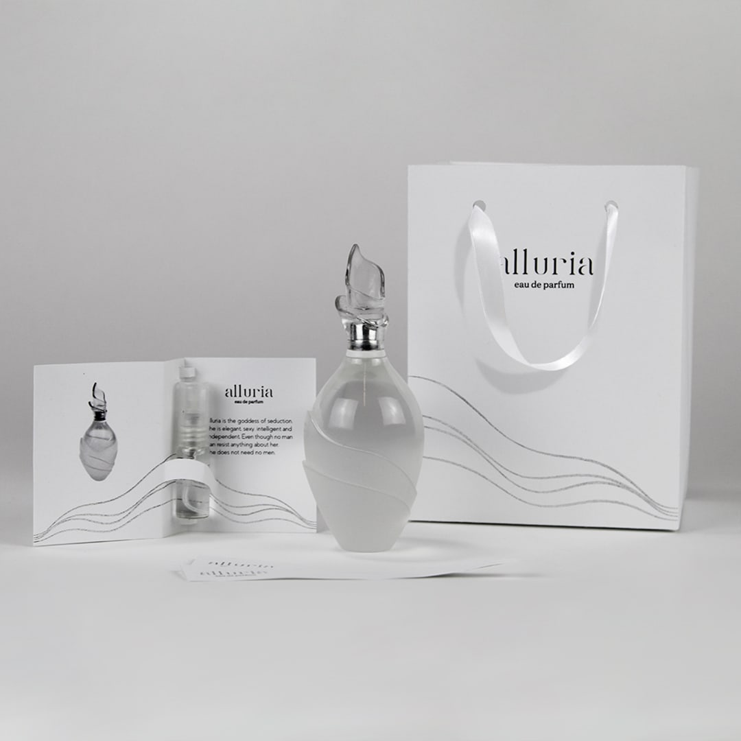 alluria is a fragrance designed for mature and confident women around the age of 25 to 45. The name came from the word allure with a twist of a female name. The word alludes to women who are so confident and beautiful that people around her just can resist loving them, like a goddess. So, the designer thought of a bottle with a streamlined shape to represent the feminine charm, the silk-like layers gently wrapping around to express the elegant and majestic aesthetic.