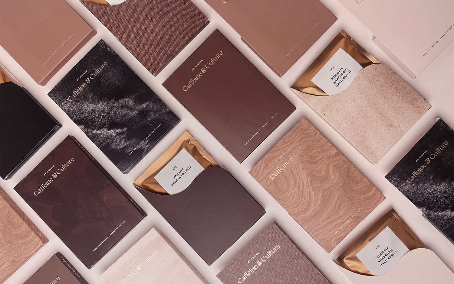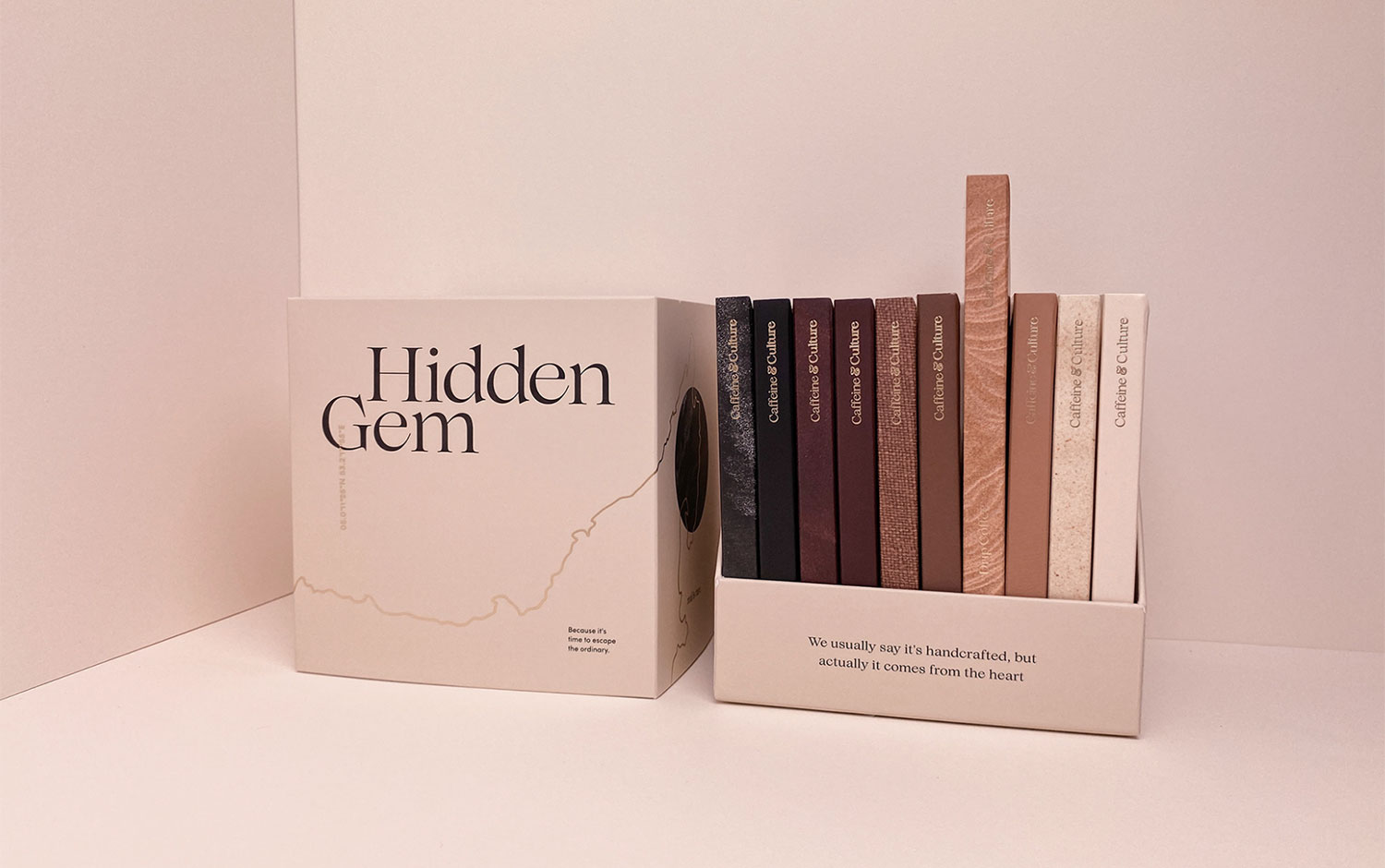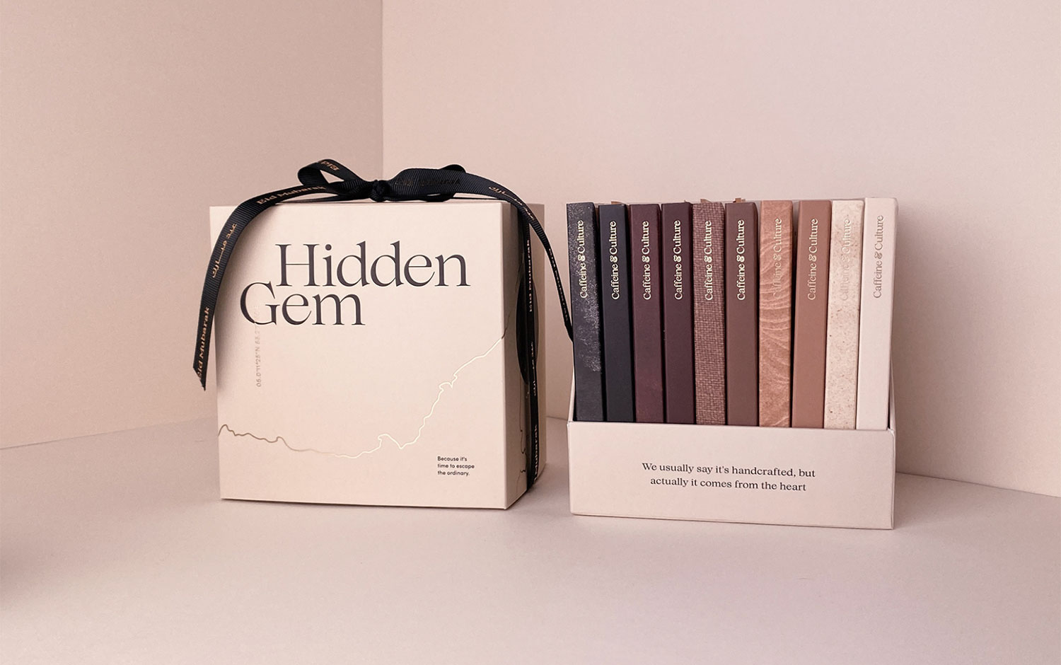 The aesthetic the design studio managed is super sophisticated and luxurious. The typography choice and colors are amazing, and the way the marbled patterns combine with the overall style is superb. We're are sure you're thinking of someone who would like to receive this surprise box as a gift. And this person would fascinate it if they are coffee-lovers.