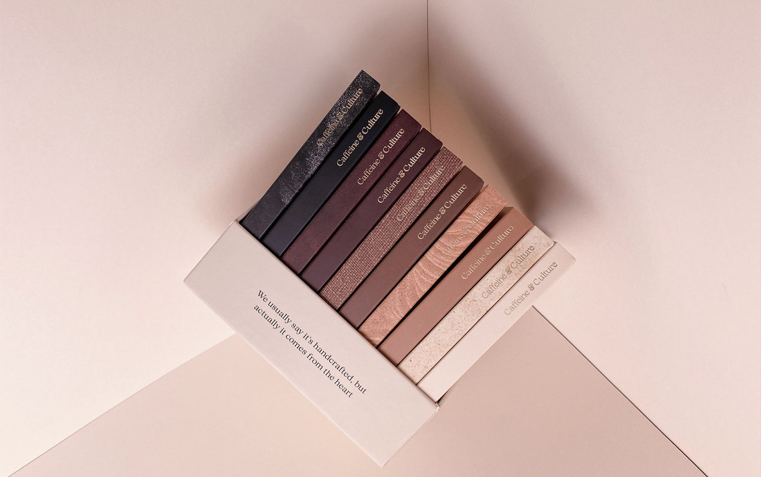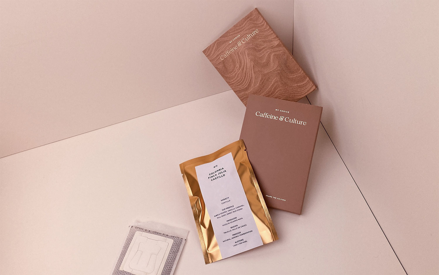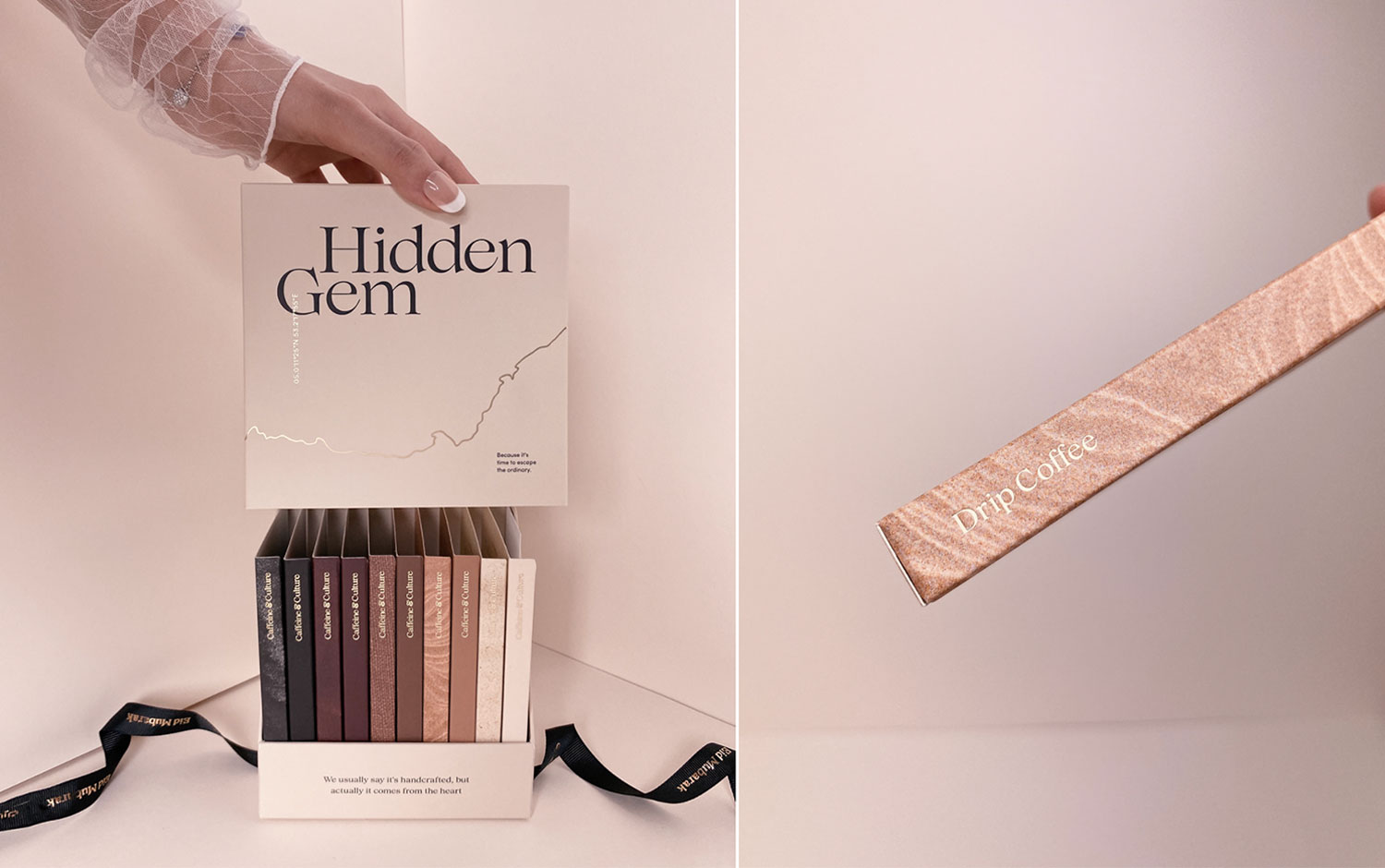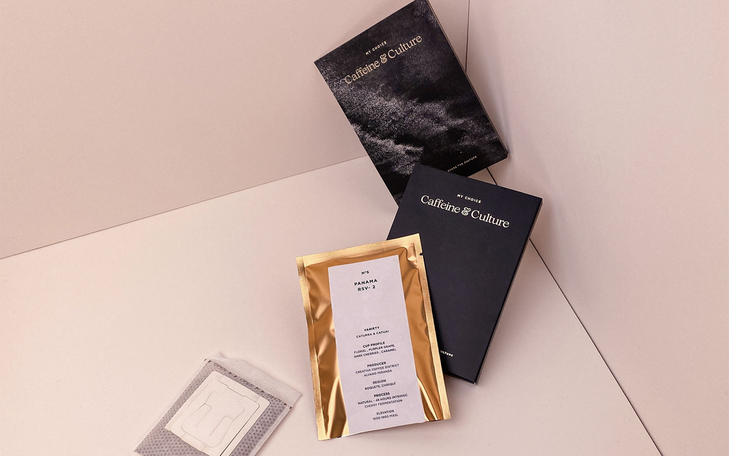 Designers thought of packaging not only to be adorable but to combine with that corner in your kitchen. Yes, you know we are talking about that personal space where you have the coffee machine and those beautiful cups with matching plates or mugs; that really depends on you ;) Each box contains ten pouches of Caffeine & Culture high-quality coffee kinds plus five different blends from all over the world. From the United Arab Emirates, Drip Coffee packaging brings this country's colors. A curious detail about the outside dark box is that the gold foil lines are drawings of the UAE map. It's a true hidden gem! When unboxing, the interior's individual containers look like books, but when opening those too, you found coffee pouches.