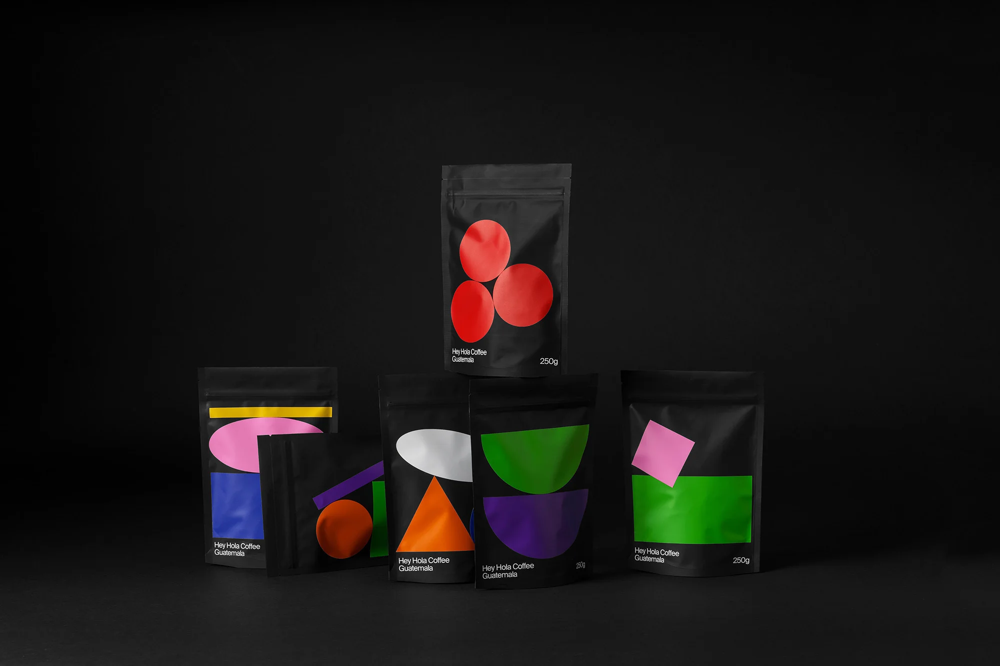 Creativity and coffee have always gone hand in hand, so the launch of Hey’s first specialty coffee—developed with their friends at Madrid-based Hola Coffee—felt like a natural evolution for the studio. The packaging captures Hey’s playful, vibrant spirit through bold geometric shapes, brought to life with hand-applied stickers. This approach makes each pouch a one-off creation, ensuring no two packages are ever the same.
