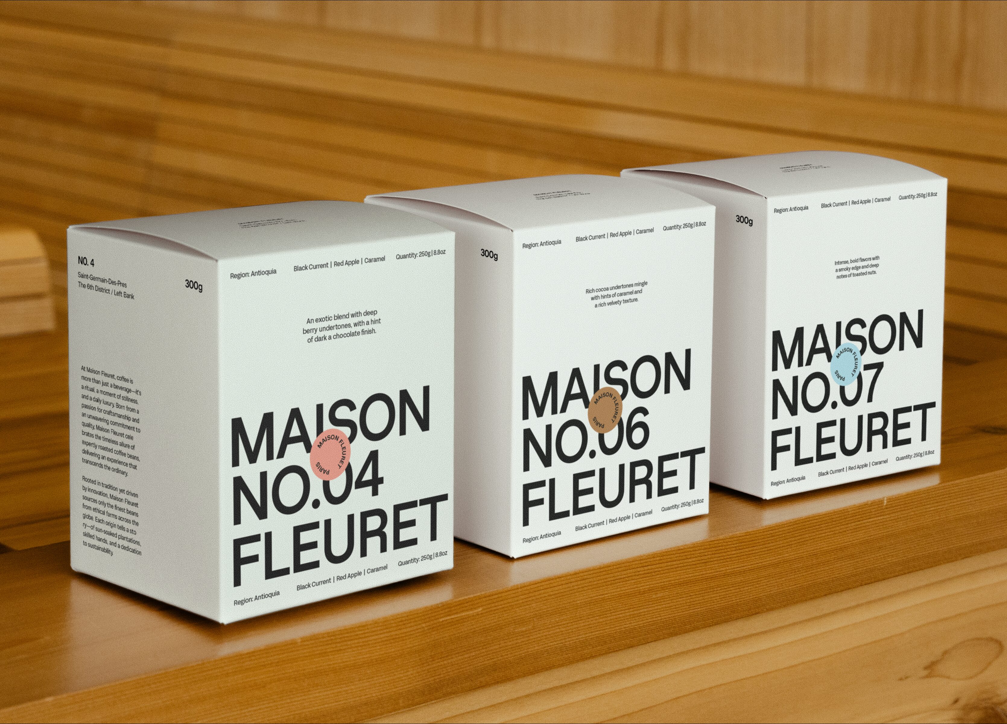 Paris-based Maison Fleuret is a refined brand spanning a coffee shop, baking school, estate, hotel, and a premium product line including wines and specialty coffees. Rooted in French tradition and sophistication, the identity by Carla Palette is intentionally timeless and understated, centered on a custom Sterling Sans logomark that adapts seamlessly across touchpoints. A supporting illustration system enriches each sub-category, while packaging uses a precise color and numeric code—borrowing clarity from luxury cosmetics—to distinguish blends and wines. The result is a cohesive brand world where every detail reflects Maison Fleuret’s commitment to authenticity, elegance, and an elevated customer experience.