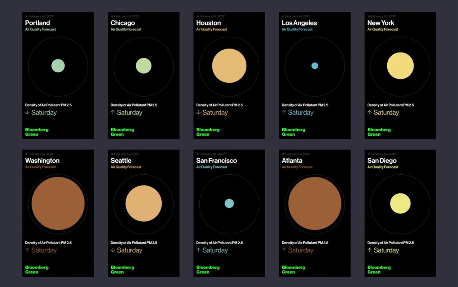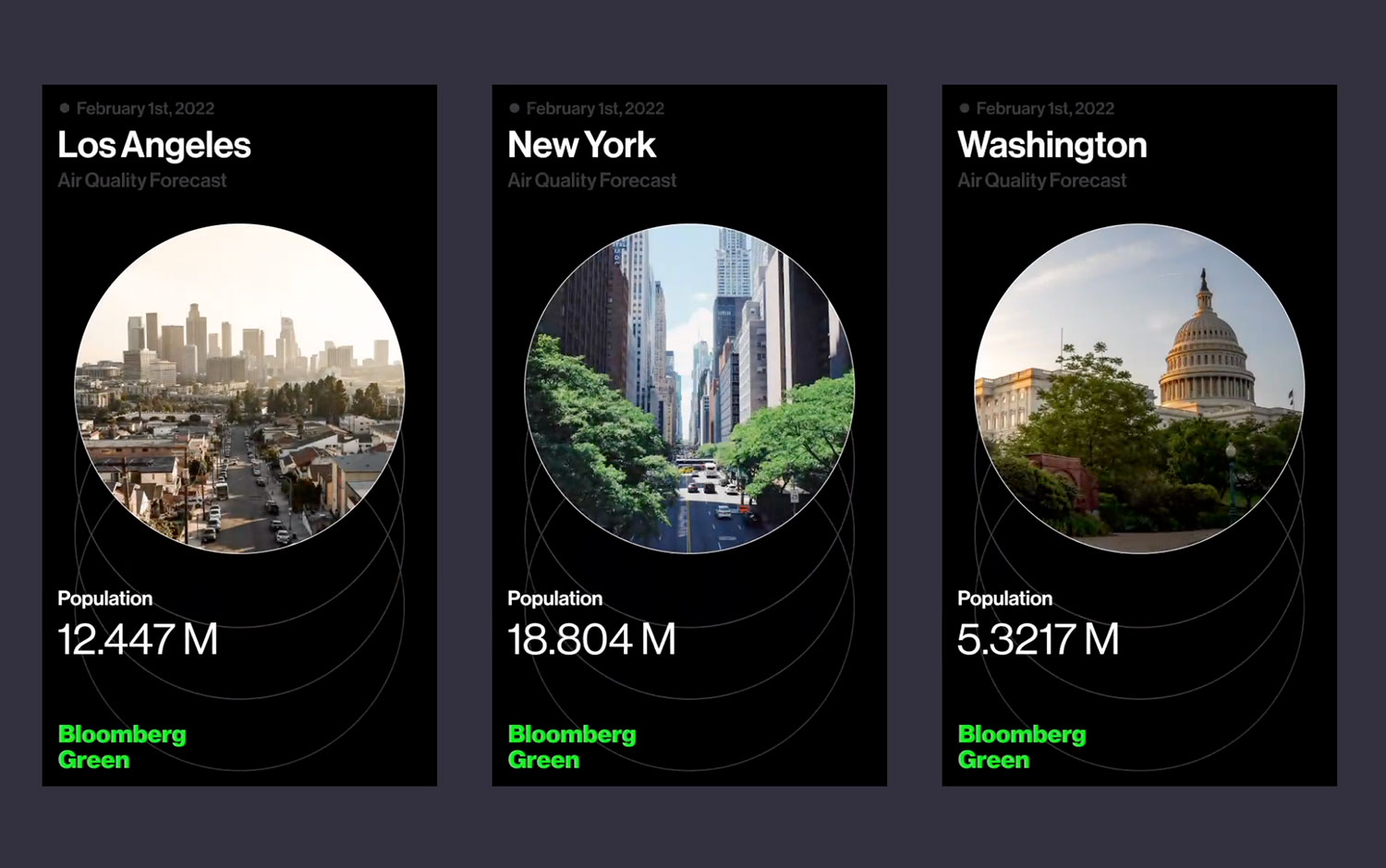 In partnership with Bloomberg Green, the Algo team designed and developed a short-form data visualization displayed in each city on the billboards of the Volta electric charging stations. The daily videos show the evolution of the Air Quality of the last four days in 12 major American cities.